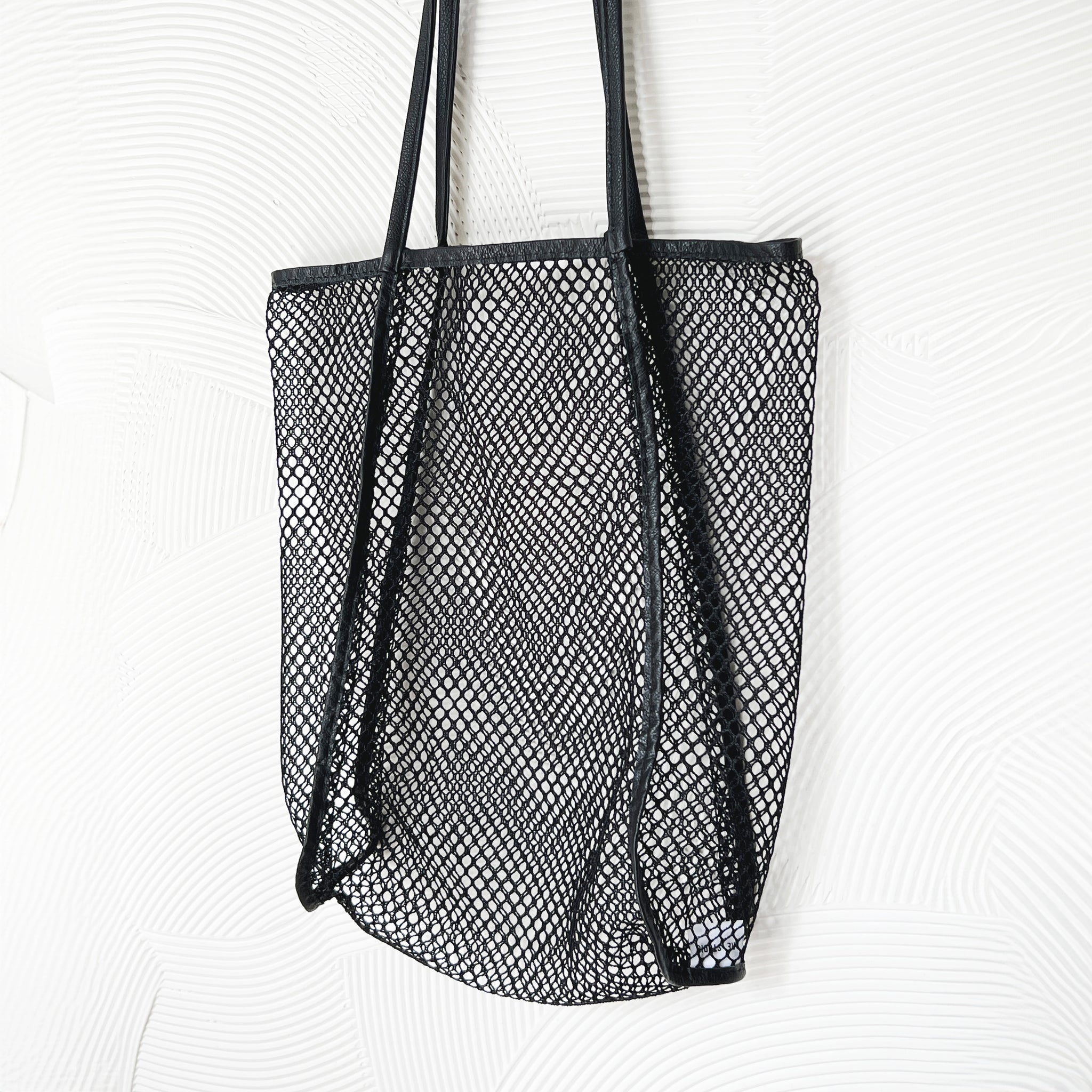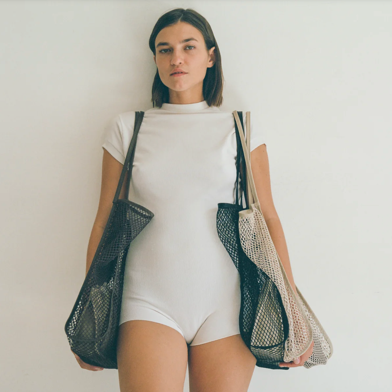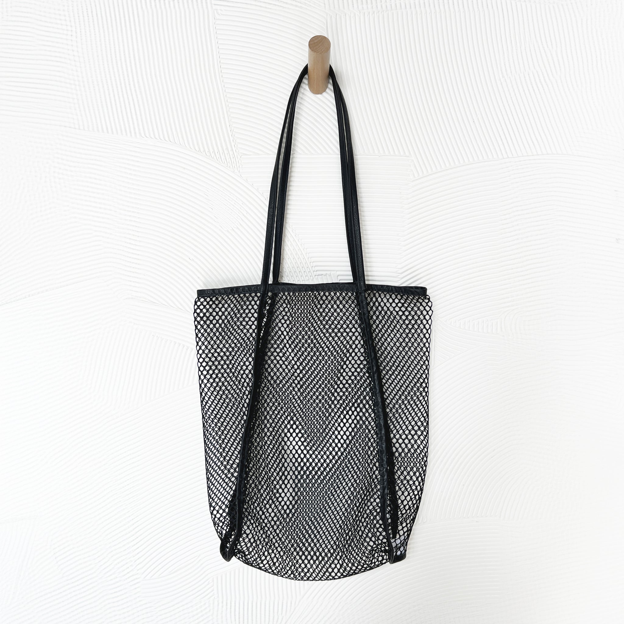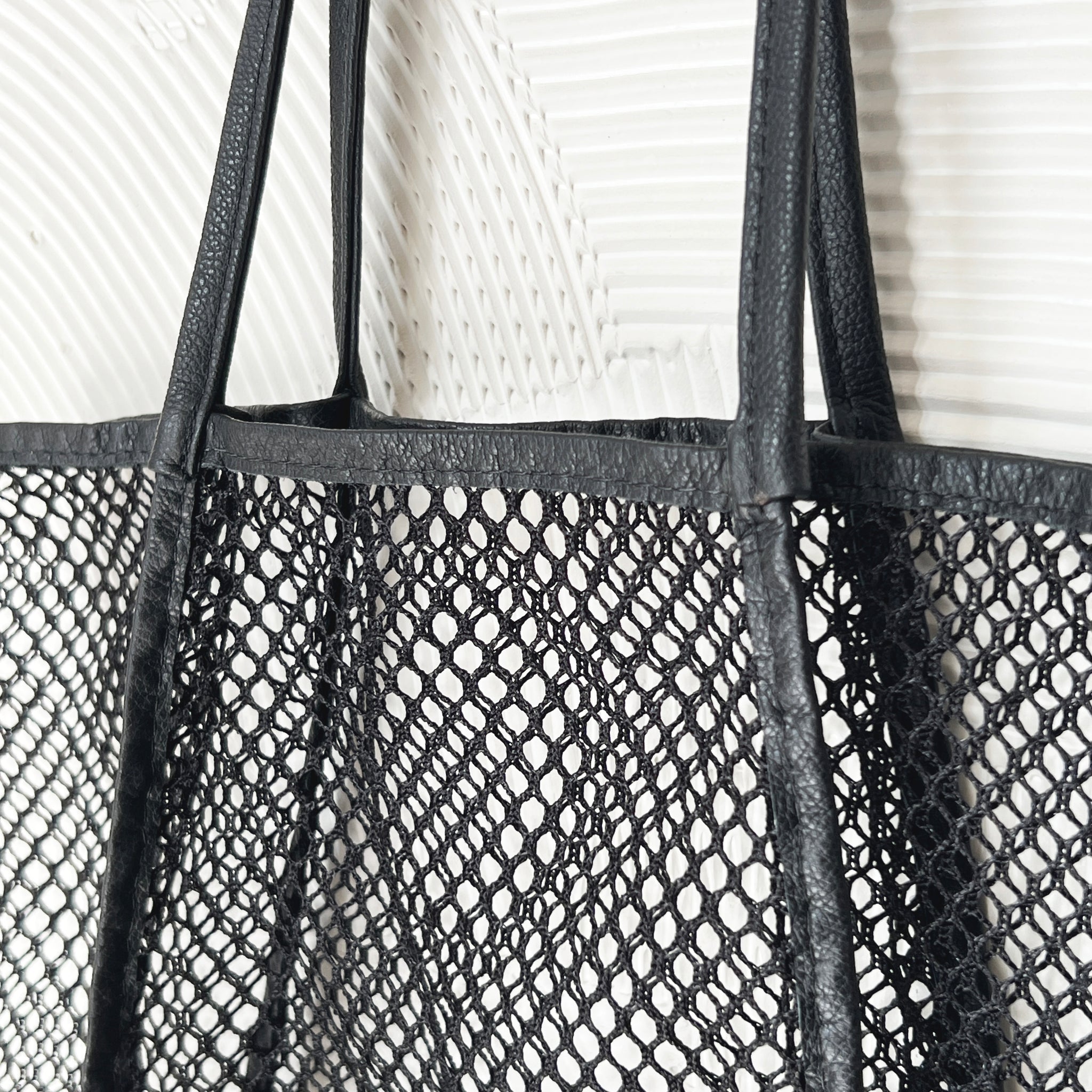 The Market Tote is made with durable netting featuring leather trim.  This tote is perfect for  farmers market runs, beach days or casual outings. Made from recycled poly and leather off-cuts from our bag production.