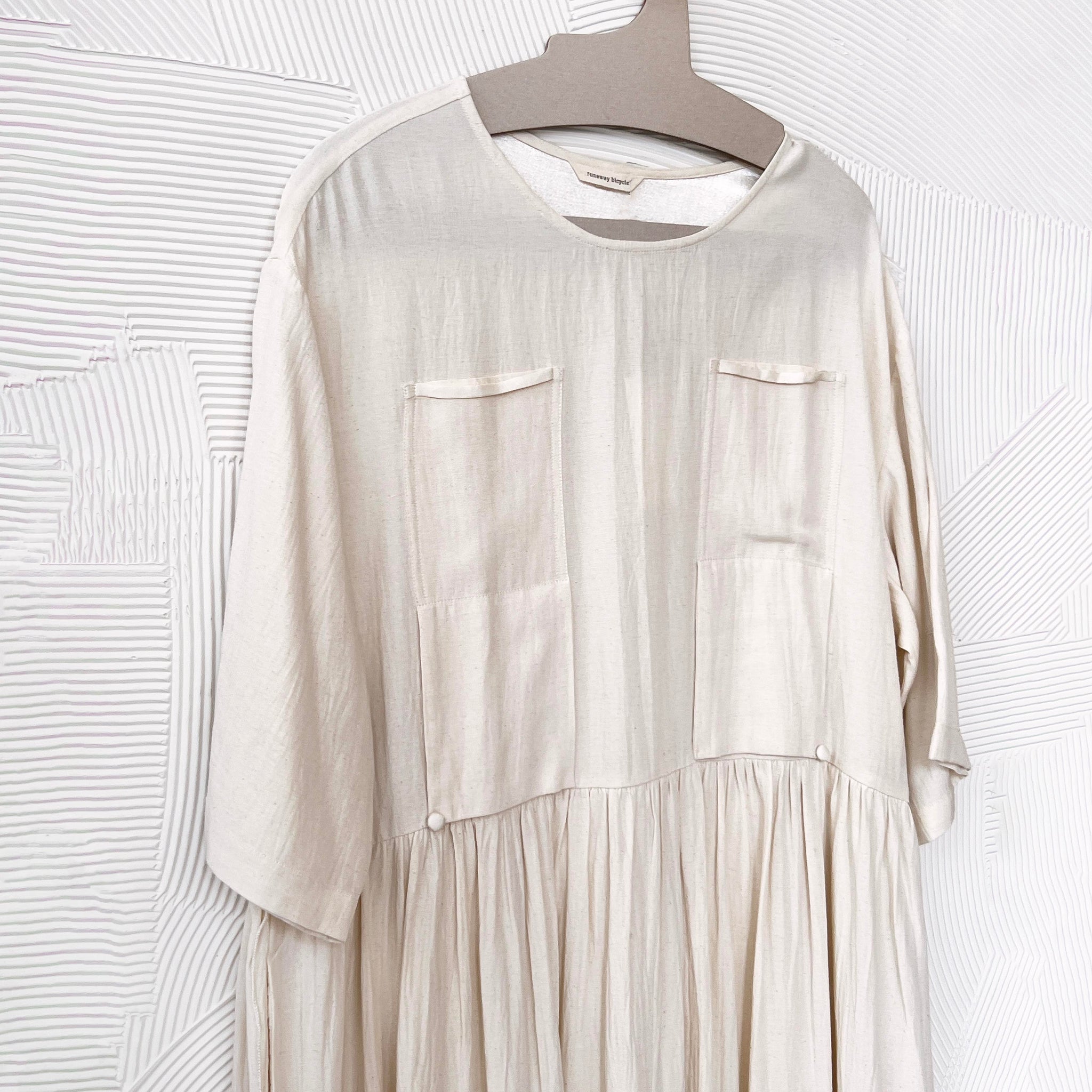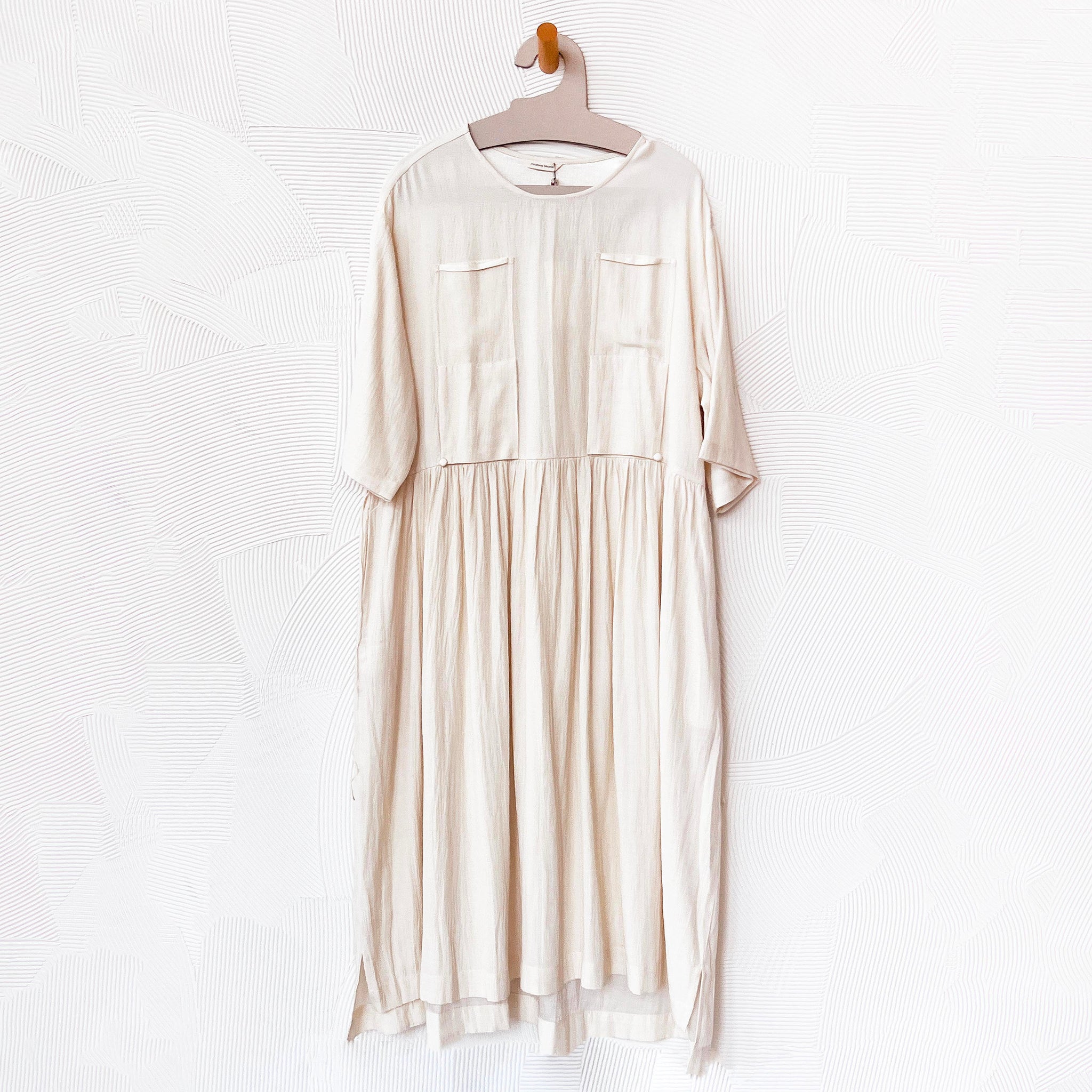 Relaxed cream dress made of 50% silk and 50% cotton. This soft dress features a rounded collar, two front pockets, and two side slits for added comfort.