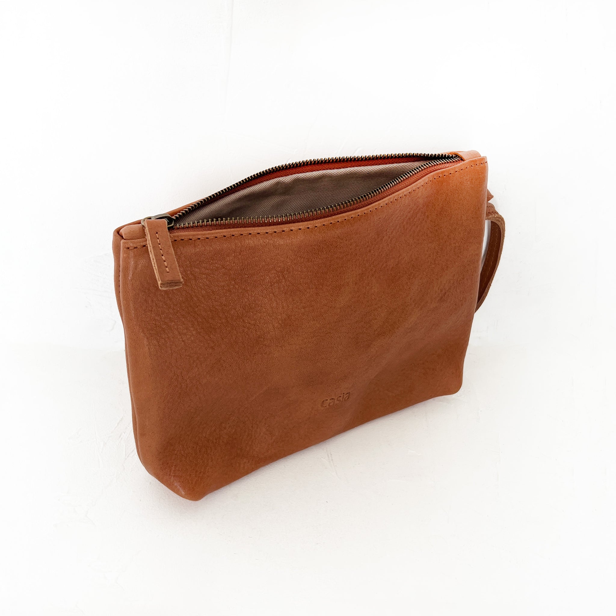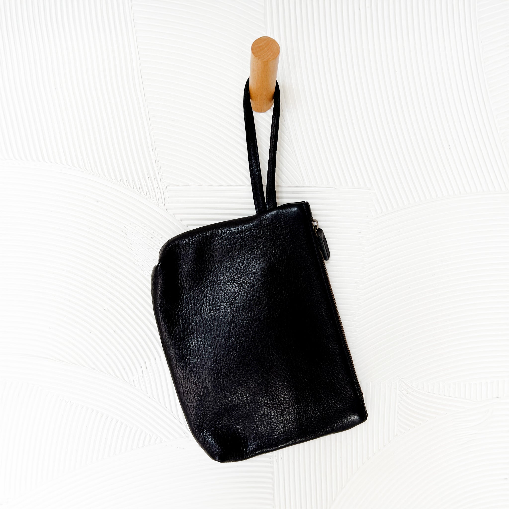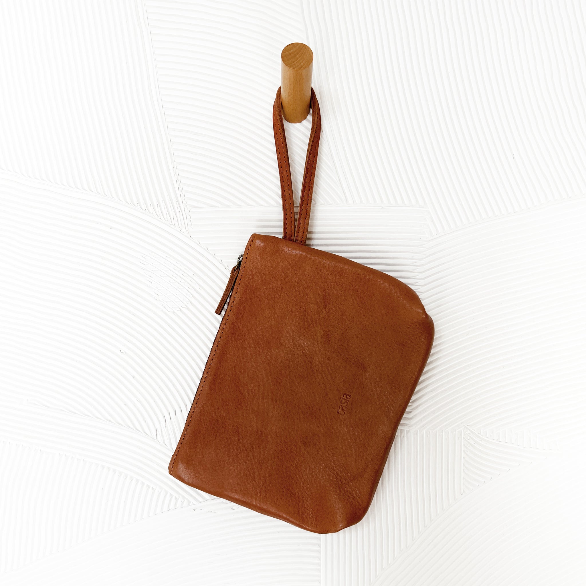 A minimalist wristlet bag handcrafted in full-grain, vegetable-tanned leather. Lined in soft cotton fabric, it features a top zipper closure and one internal zippered pocket to carry essentials securely. Its clean silhouette and timeless design make it ideal for evening outings or elegant everyday use. Made in Argentina.