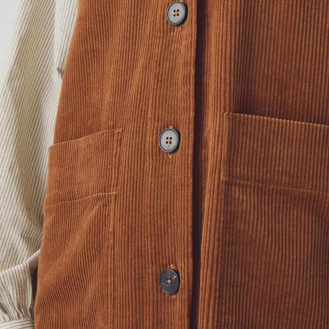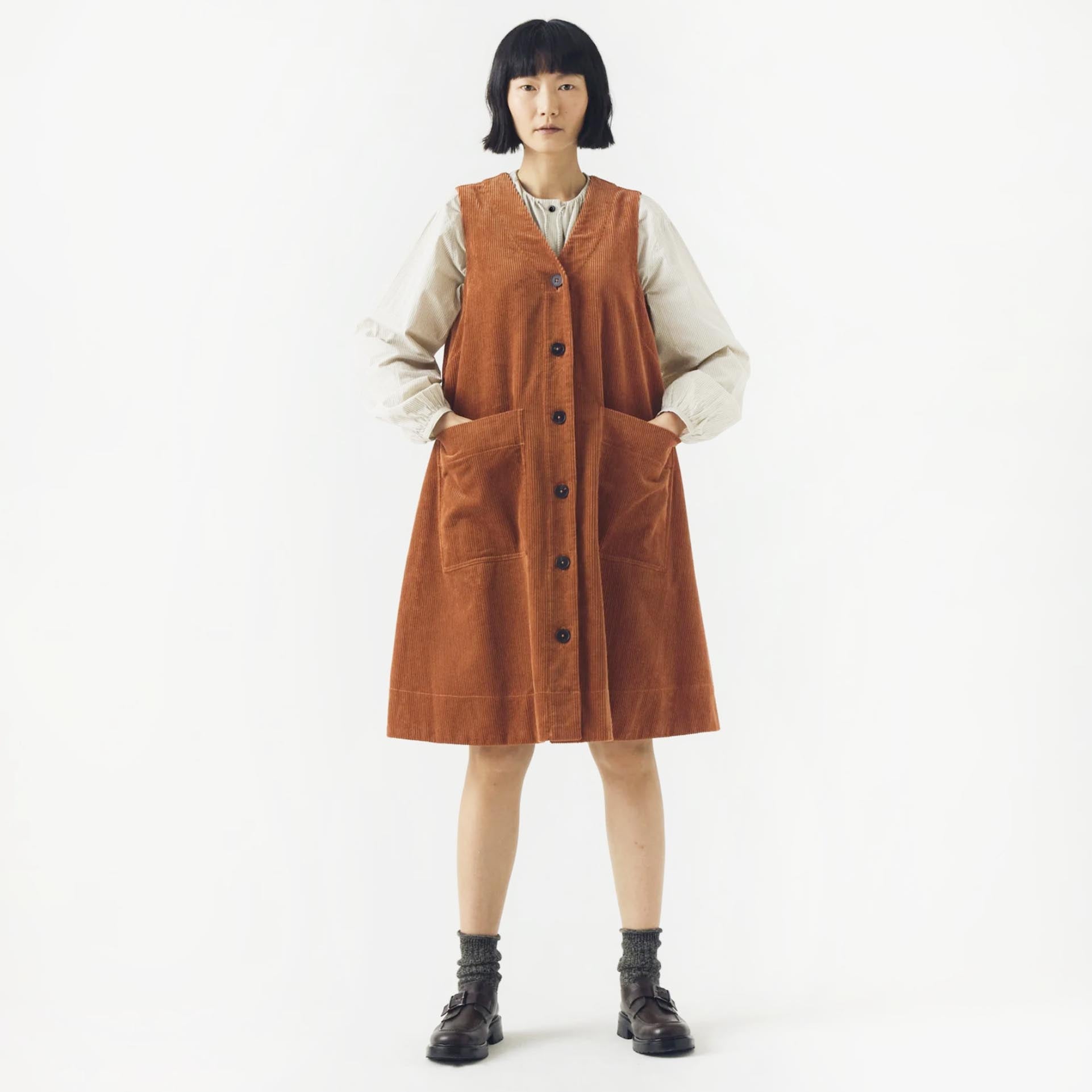 Dress made from organic cotton cord with an A-line shape falling to the knee. Finished with large patch pockets and horn buttons.