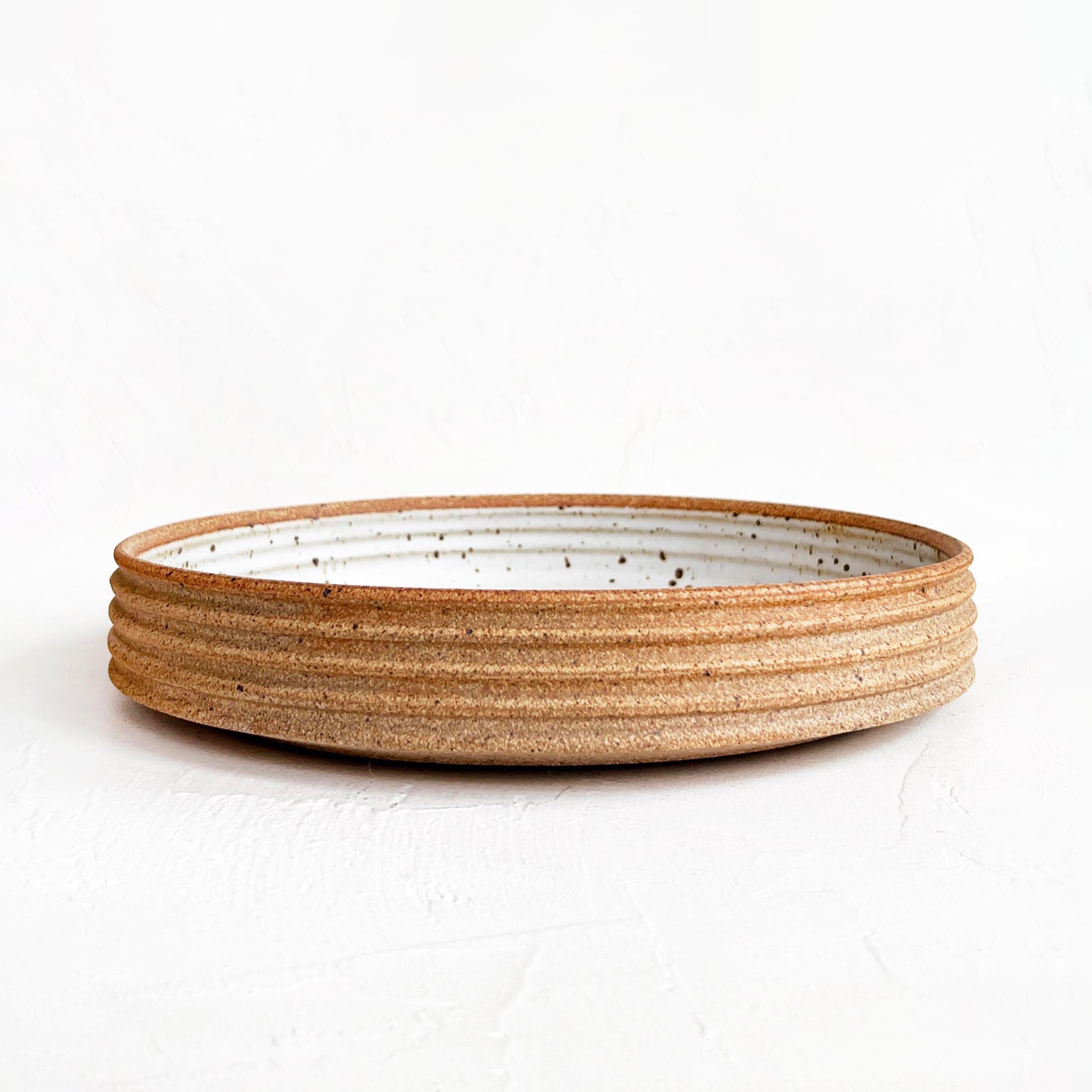 A functional solution for holding fruit or serving a hot side dish with style. This serving bowl has a ribbed, unglazed rust exterior with a speckled matte white center.