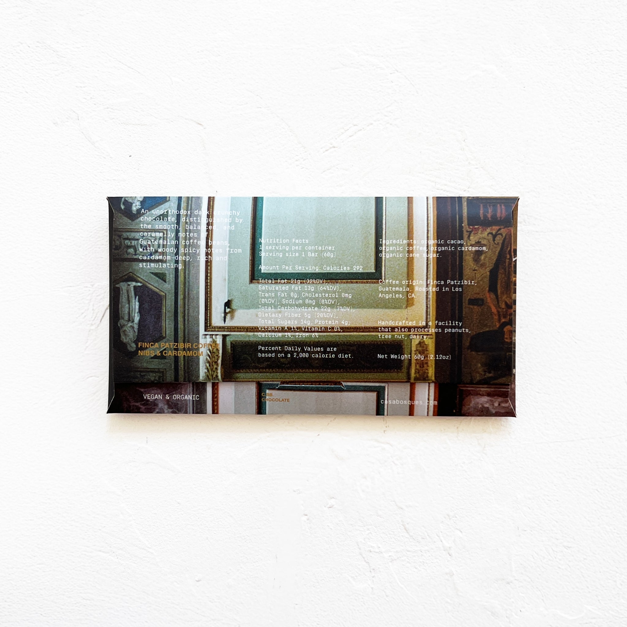 Ingredients: Cacao beans, organic raw cane sugar, cloud forest cardamom, Guatemalan coffee beans