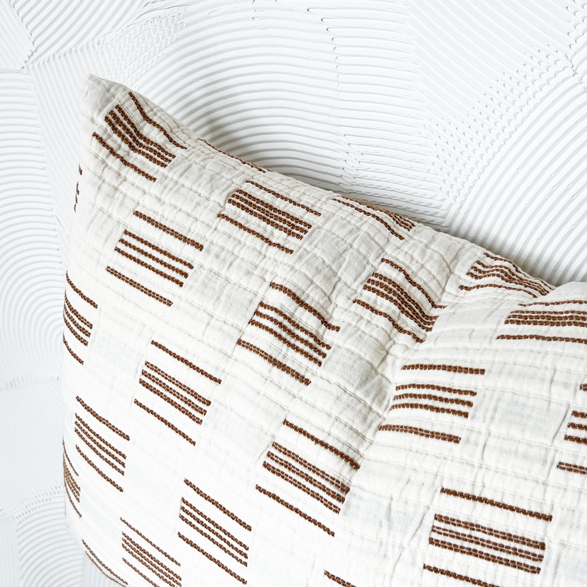 This pillowcase is crafted from a durable stonewashed cotton fabric in off-white, featuring brown woven stripes as a decorative detail. The unique weaving technique creates an attractive striped pattern. It includes a hidden zipper at the bottom and the pillow insert.