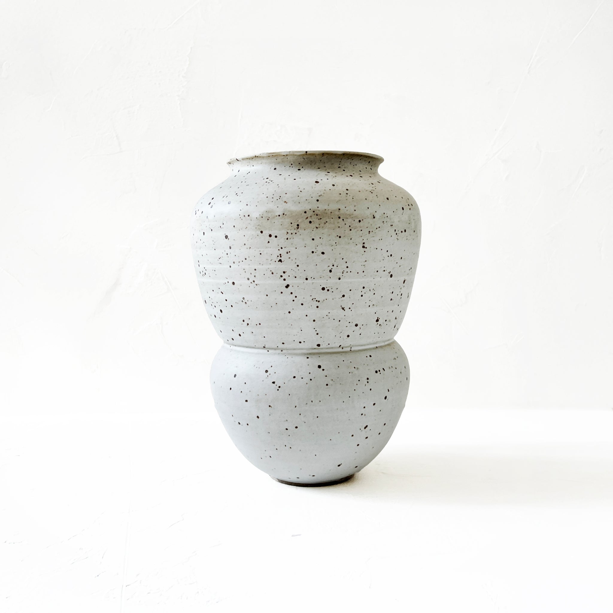 A segmented cylinder gray vase with light speckling throughout. Its glazed interior makes this vase suitable for both fresh and dried flowers.