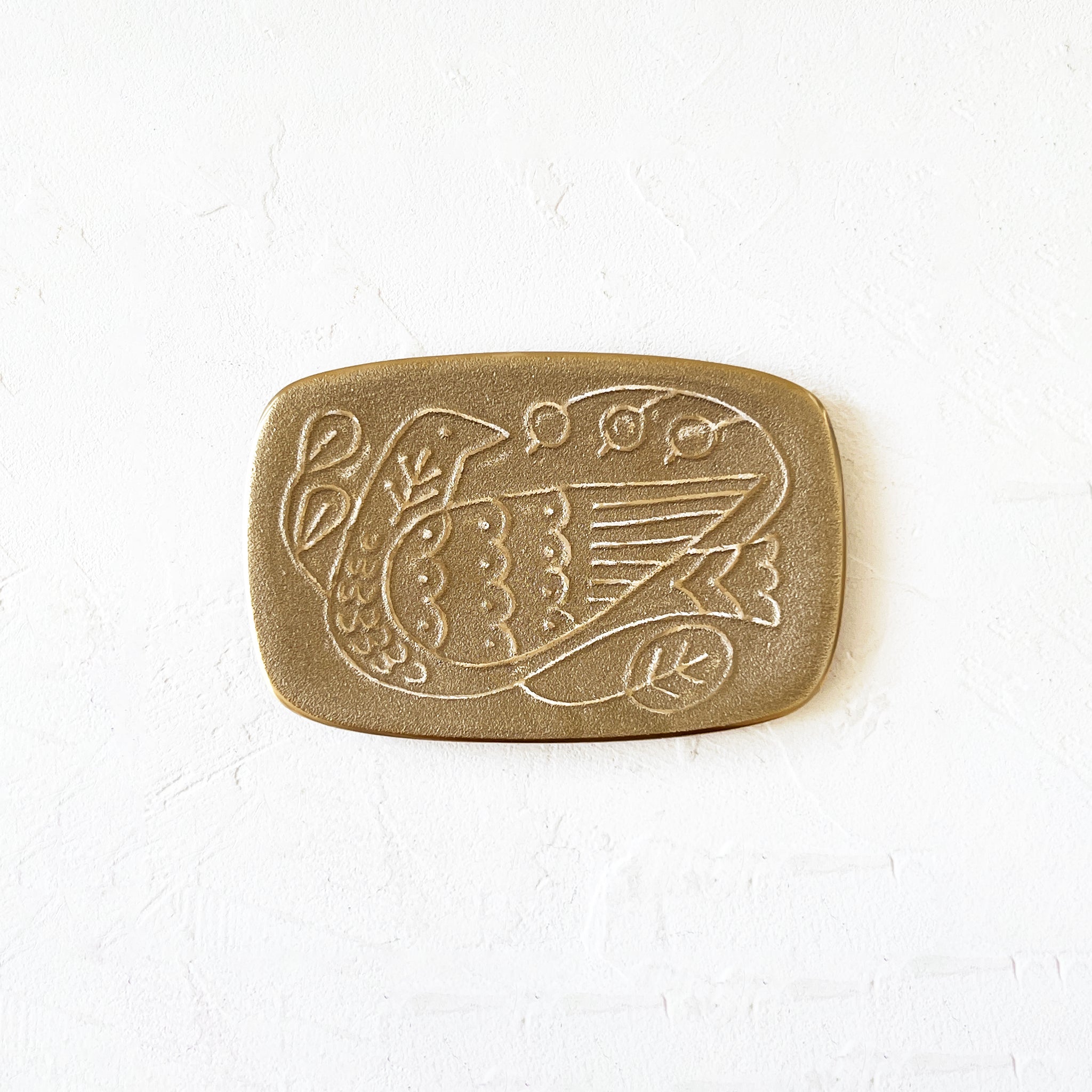 Discover the charm of this handmade brass tray featuring an enchanting bird design. Collaborating with a talented Japanese ceramic artist, Castin' blends traditional Takatsuji craftsmanship with contemporary style. This versatile piece enhances any space and is perfect for organizing your office, displaying jewelry, or serving as a stunning altar centerpiece. Embrace the artistry that adds elegance to your home and creates a cherished heirloom for generations.