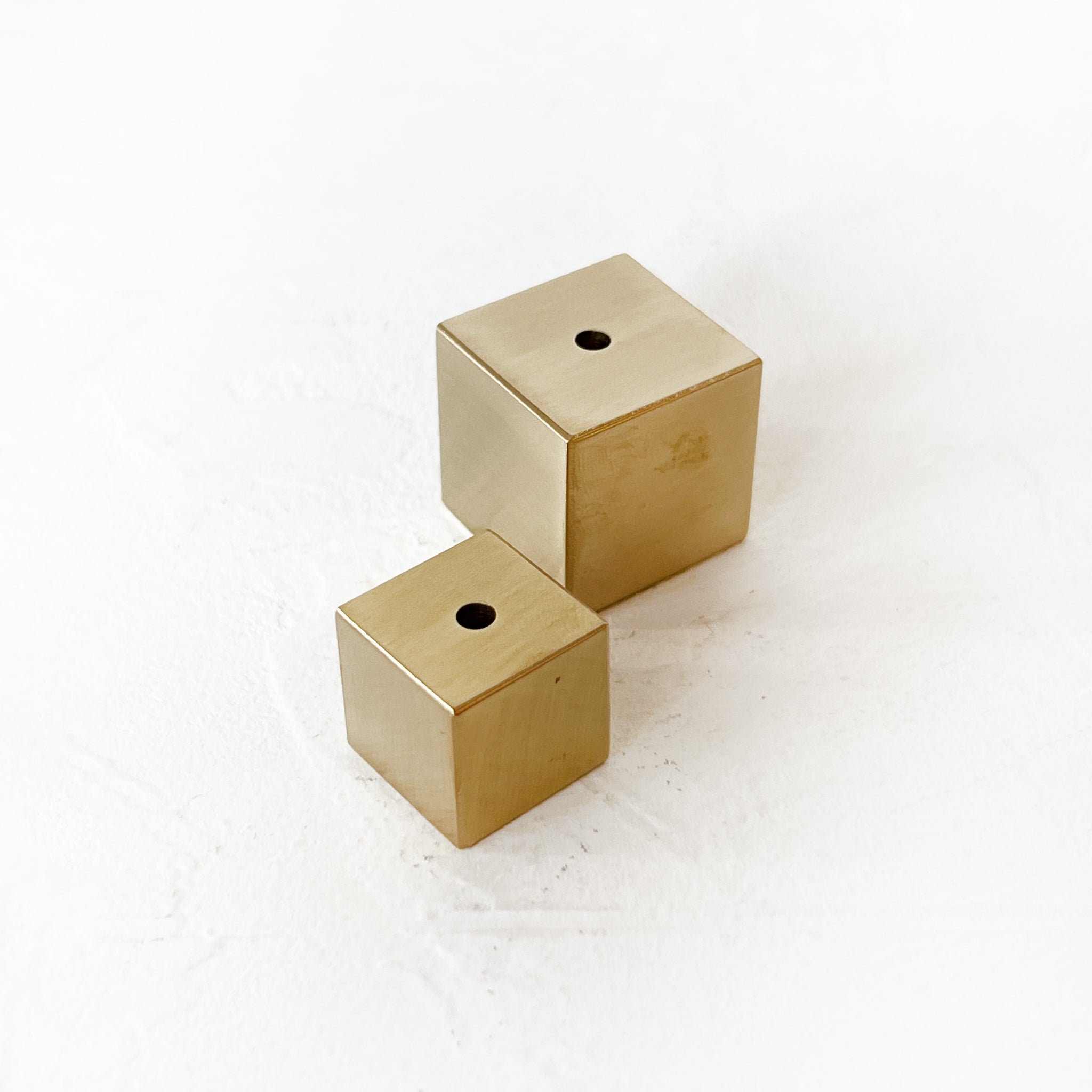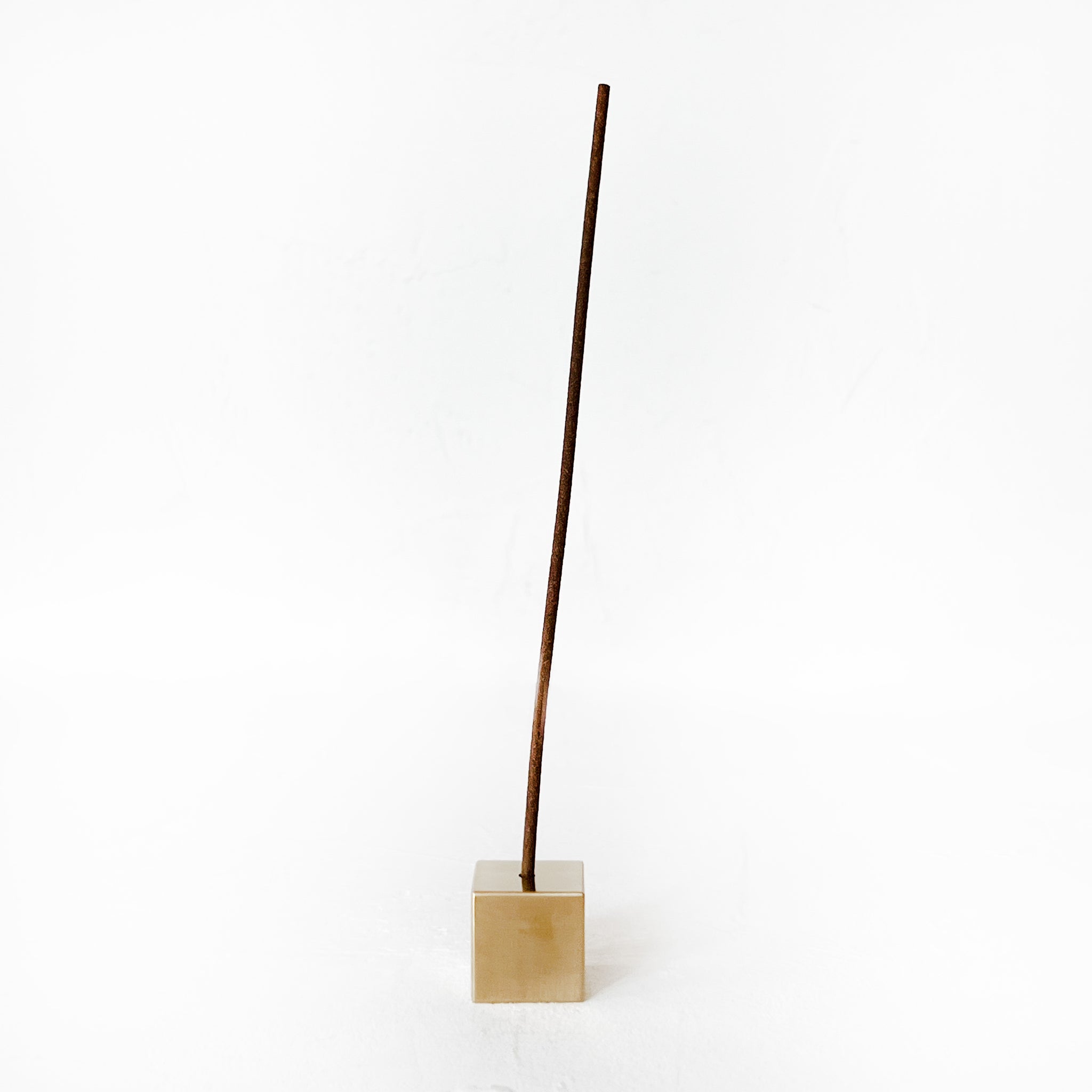Cubic stick incense holder, made of polished brass and features a modern, minimalist design. It has a generous-sized hole at the top to accommodate various sizes of incense sticks.
