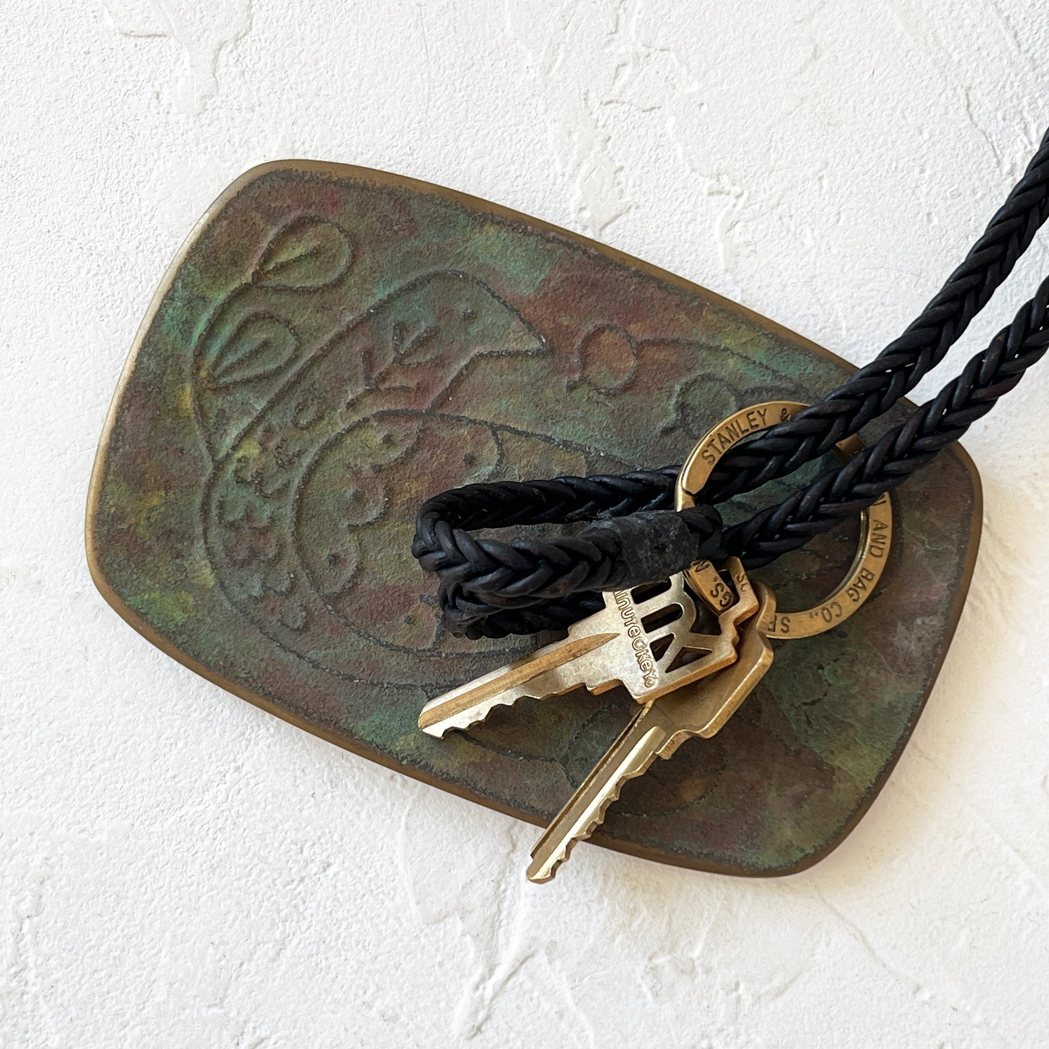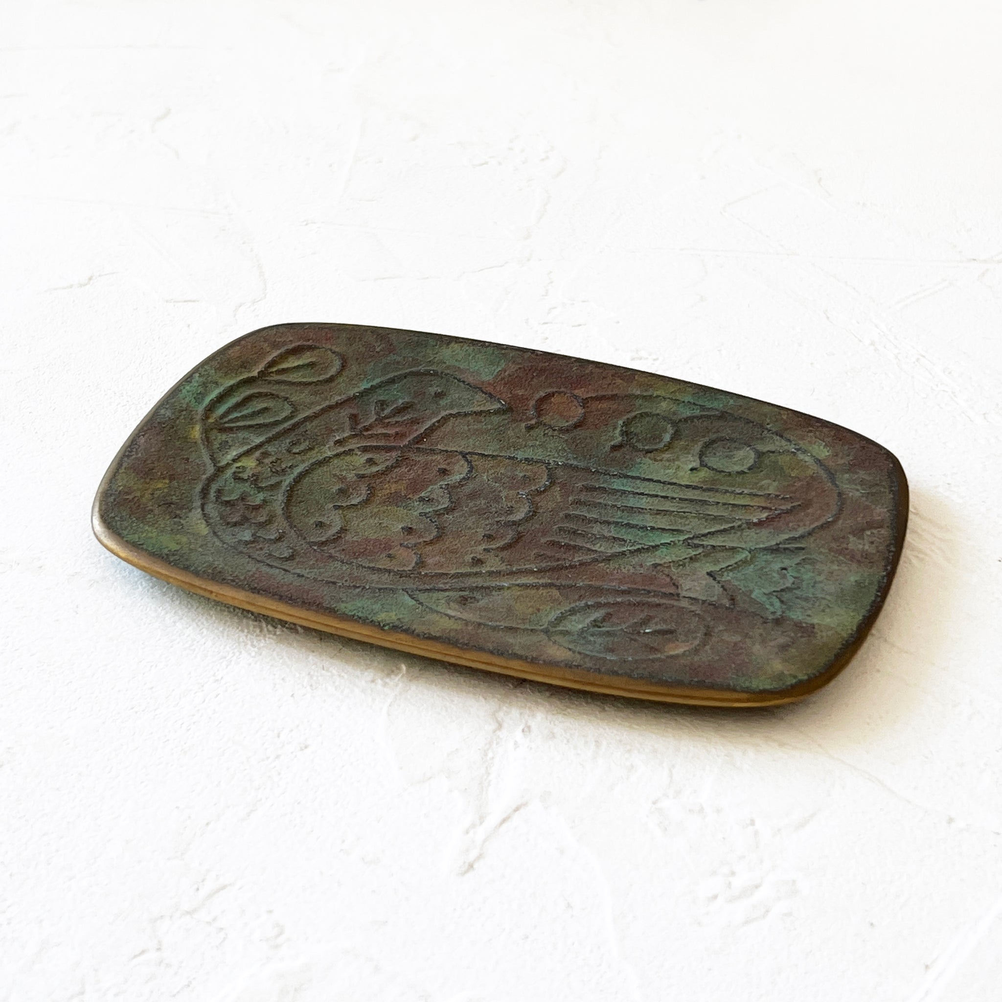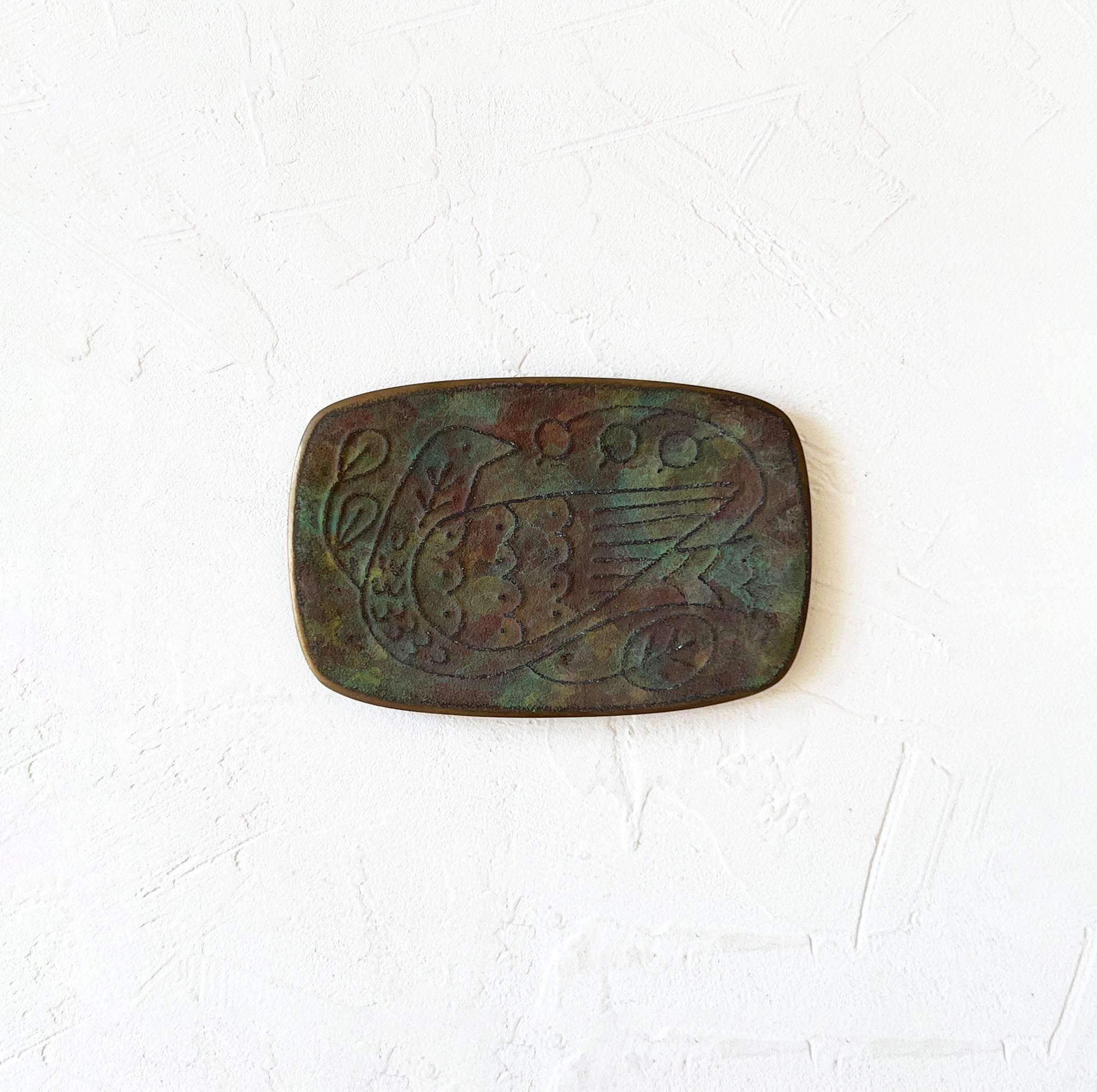Brass-etched bird tray, featuring a vibrant patina of deep red and green. This unique piece blends traditional elegance with contemporary style, showcasing a collaboration between Takatsuji and a skilled Japanese ceramic artist. Versatile in its use, it can display jewelry, serve as a stunning altar centerpiece, or act as a striking decorative accent, adding elegance and intrigue to any space!