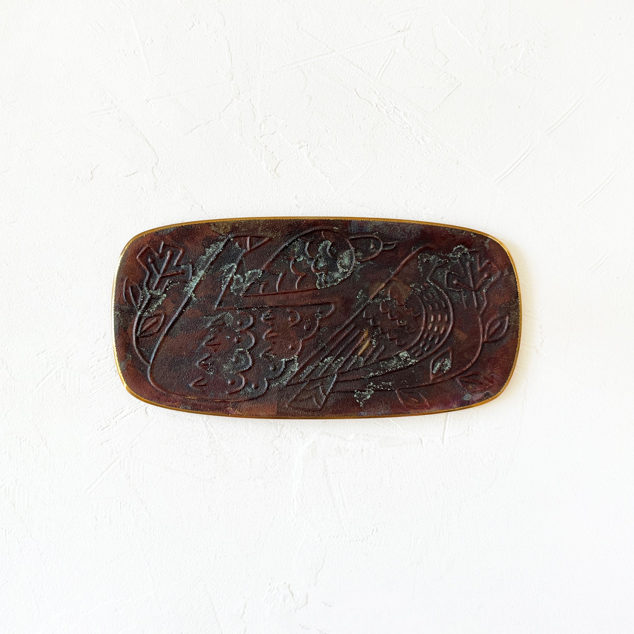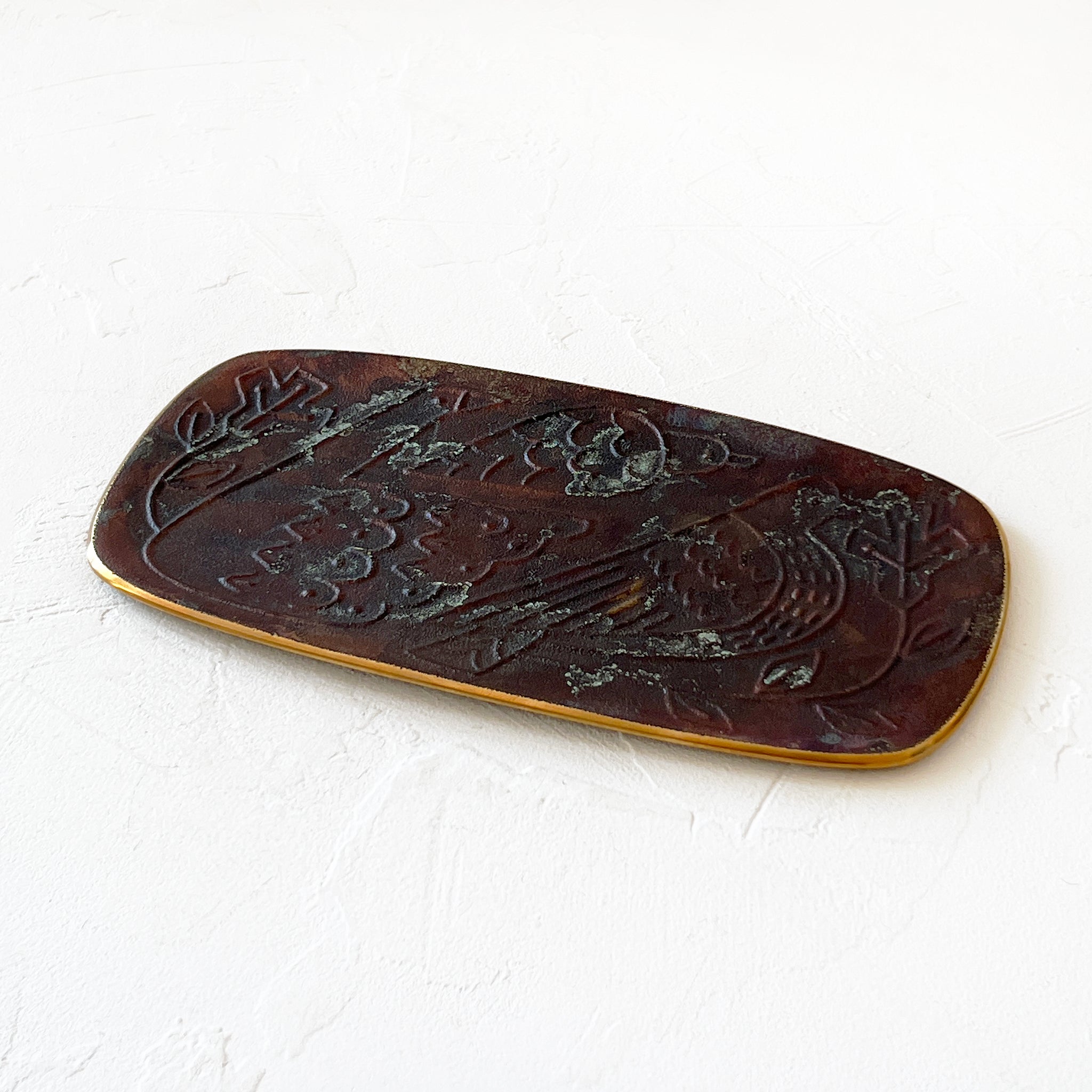 Brass-etched bird tray, featuring a vibrant patina of brown and turquoise. This unique piece blends traditional elegance with contemporary style, showcasing a collaboration between Takatsuji and a skilled Japanese ceramic artist. Versatile in its use, it can display jewelry, serve as a stunning altar centerpiece, or act as a striking decorative accent, adding elegance and intrigue to any space!