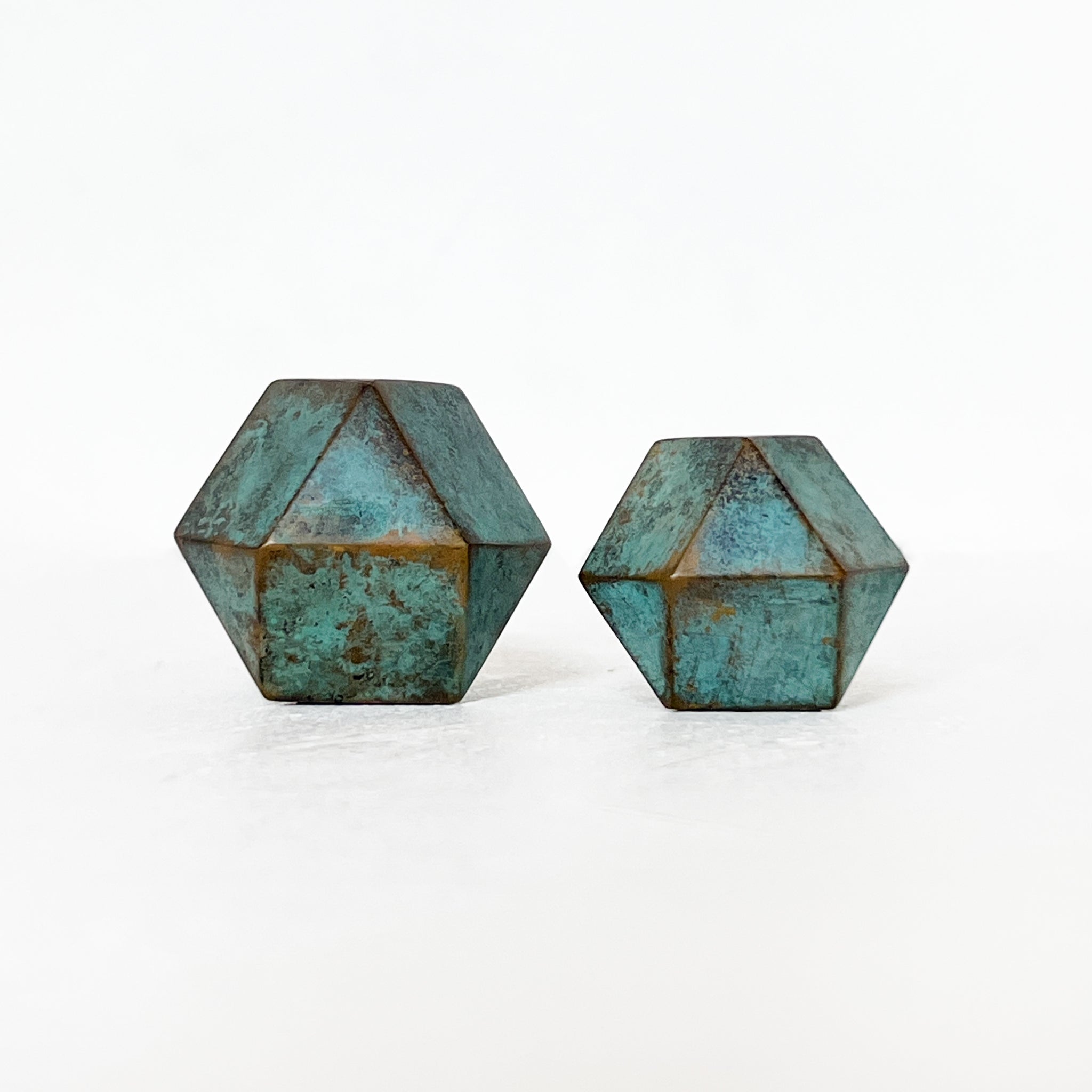 Stunning tetra-decagon paperweight, showcasing a rich turquoise patina that adds a touch of elegance to any space. This exquisite piece is not only a beautiful work of art but also serves a practical purpose.