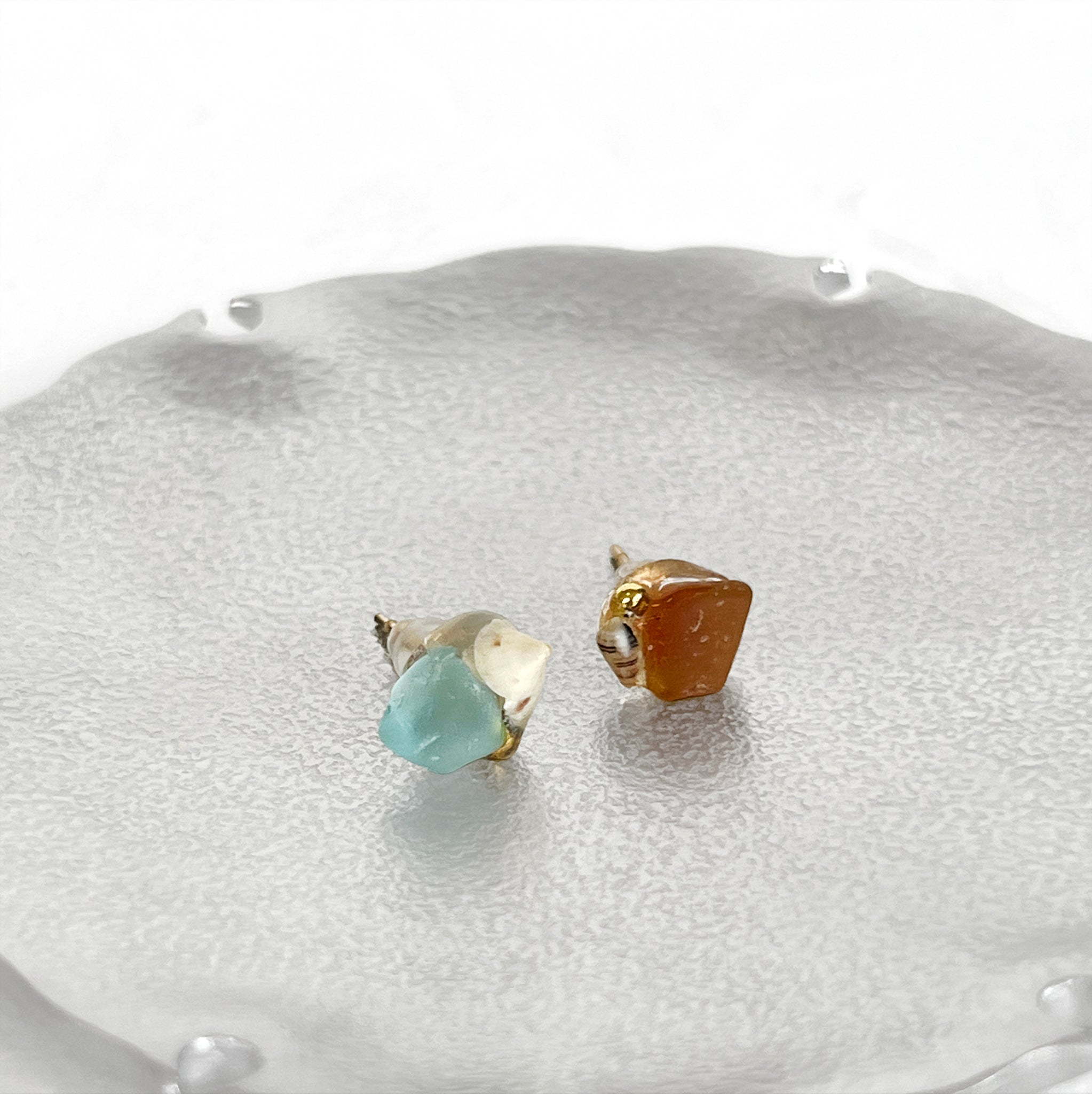 Unique asymmetrical shell stud earrings, meticulously crafted from brown and turquoise sea glass, and elegantly accented with a subtle gold bead. Thoughtfully made in Japan.