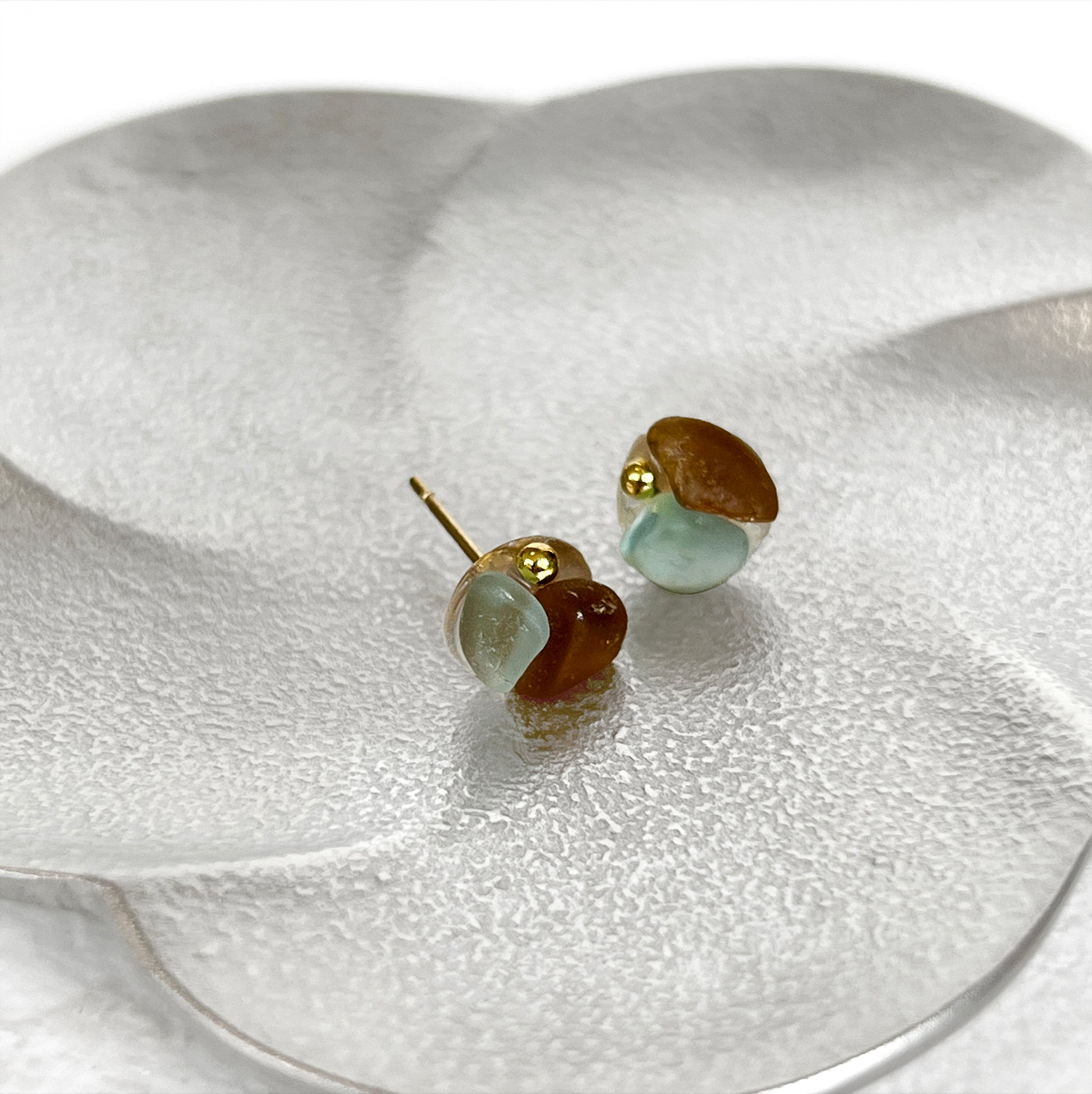 Asymmetrical shell stud earrings made from brown and clear sea glass are elegantly accented with a subtle gold bead. They are thoughtfully crafted in Japan