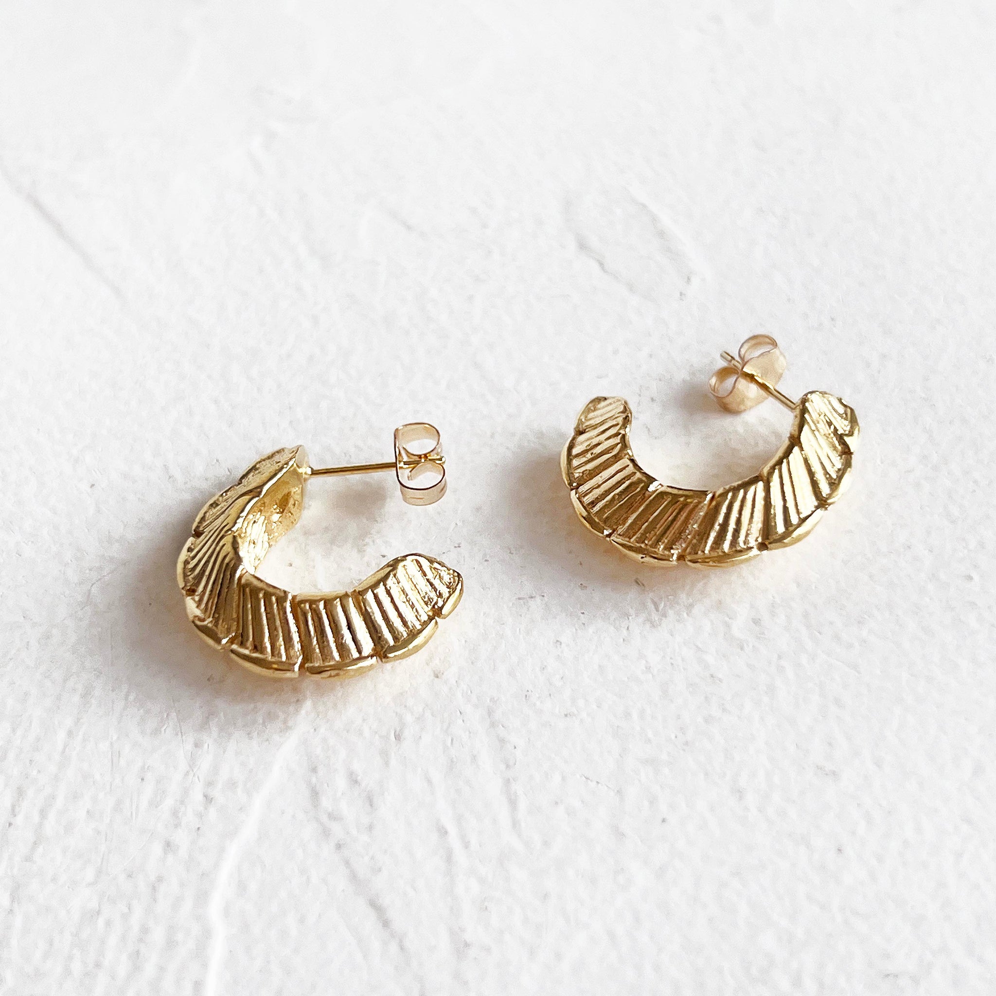 Inspired by laurel wreaths, ancient symbols of strength, honor, and achievement, these hand carved sculptural hoop earrings blend organic lines with subtle geometric texture. Slight variations catch the light like foliage in motion, creating contrast, depth and dimension. A unique pair that complements any style. Made from 14k gold coated recycled brass on sterling silver ear posts.