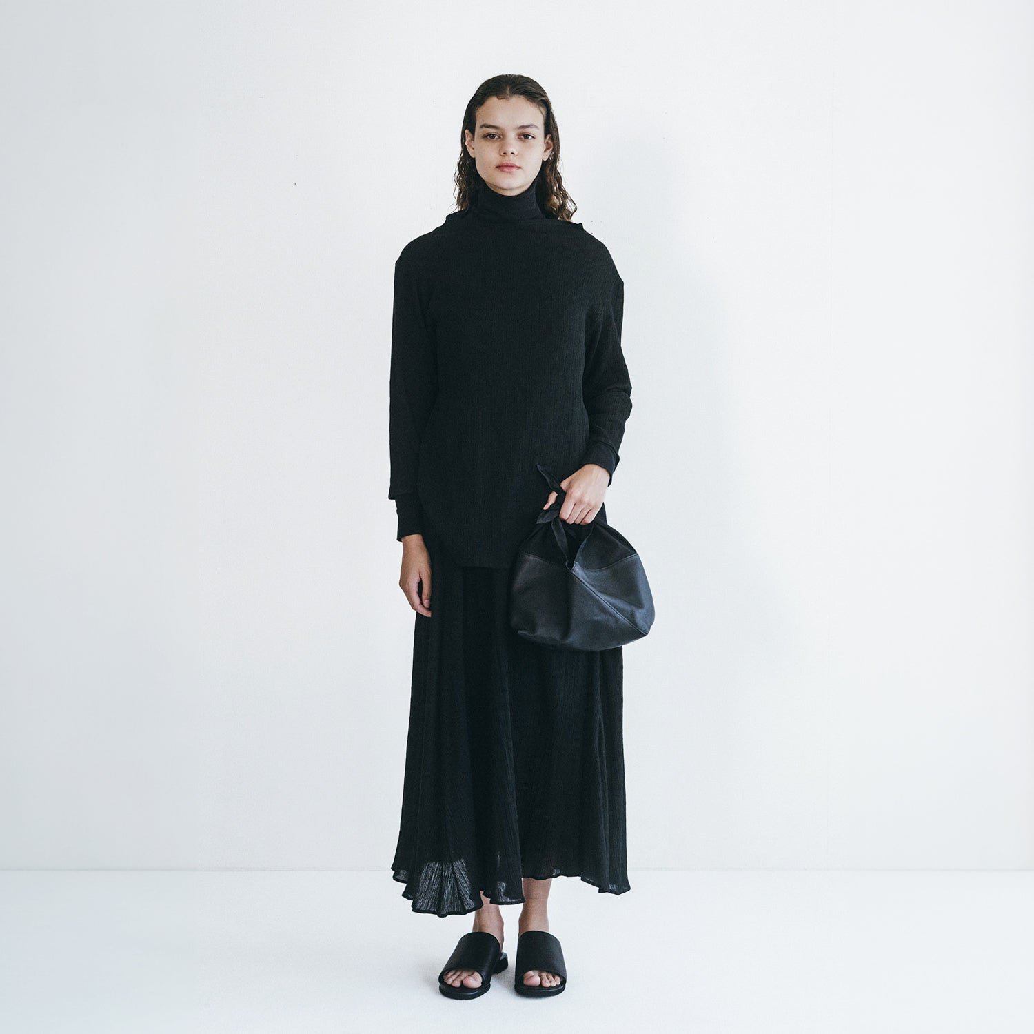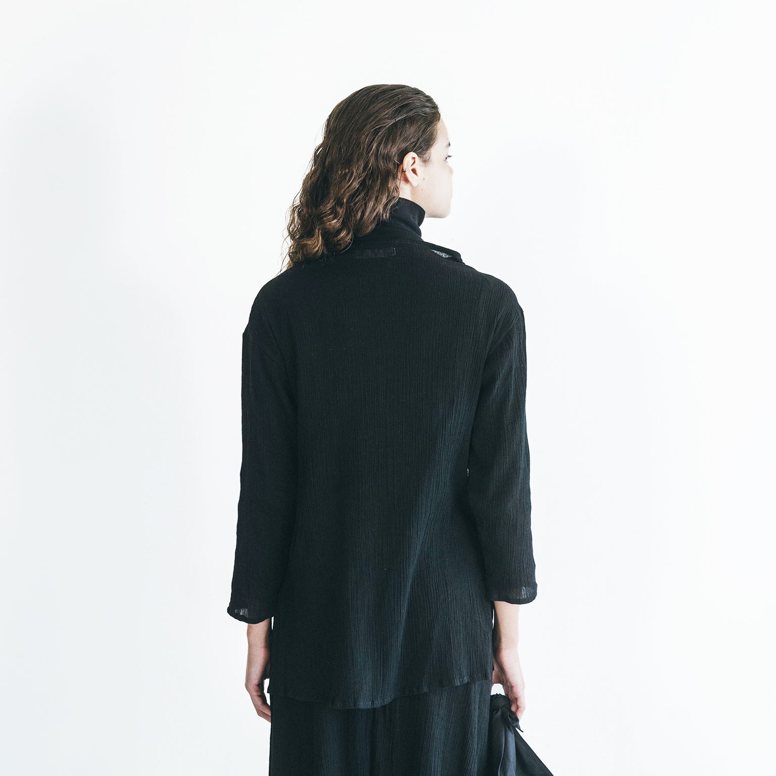 A textured pullover featuring a sheer, crinkled fabric with light stretch for a stress-free, breezy fit. The modest bottle neck adds a soft touch around the neckline, while the longer hem and side slits enhance ease of movement. Perfect worn alone or layered under cardigans, gilets, or jackets during transitional seasons.