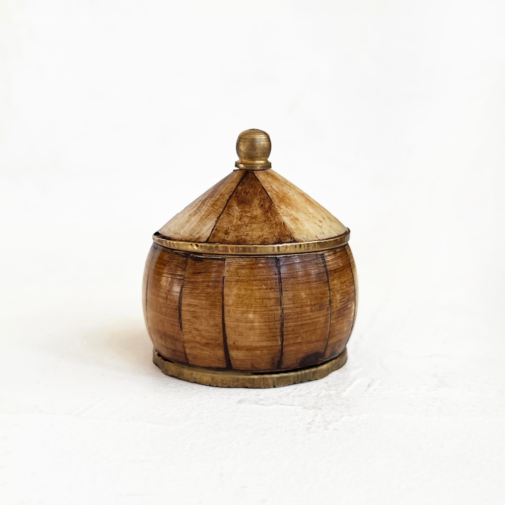 Antique bone and brass trinket box with a domed lid and a segmented body. It is in excellent vintage condition.