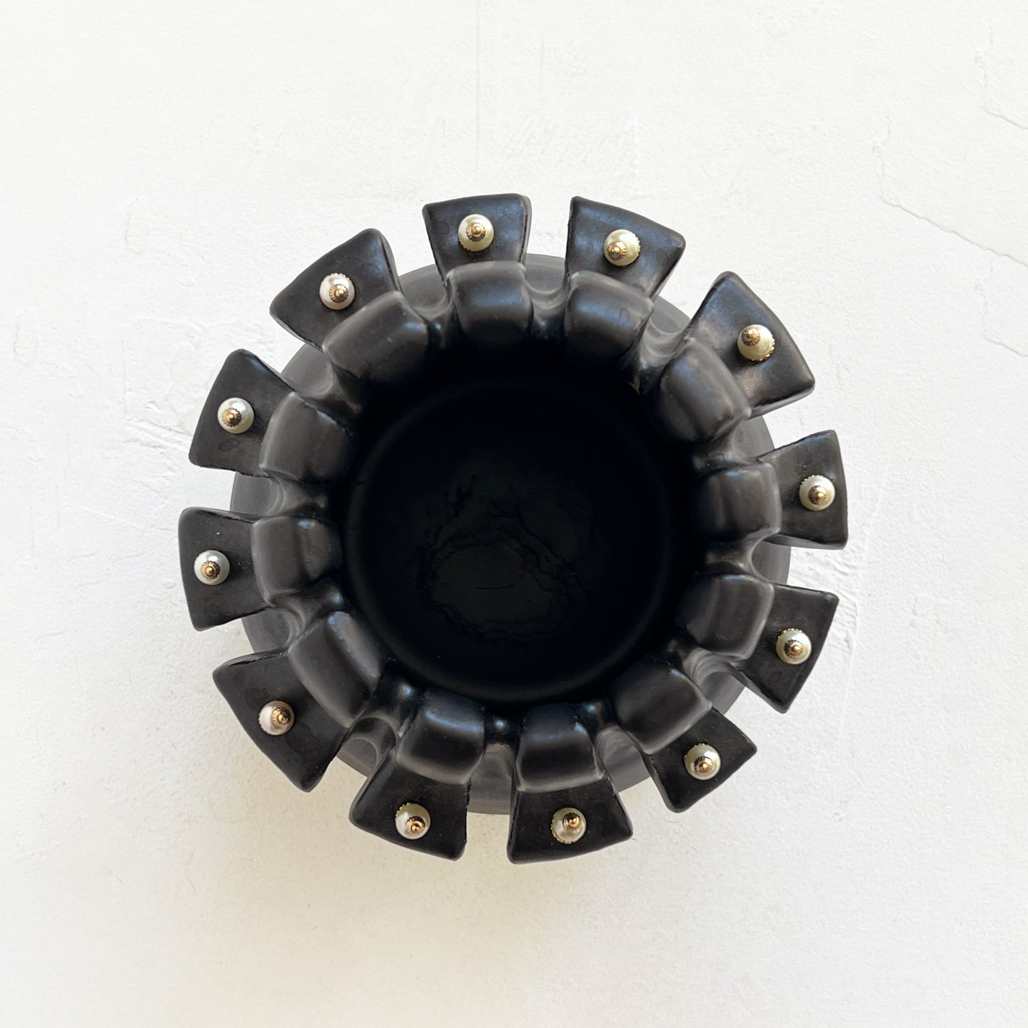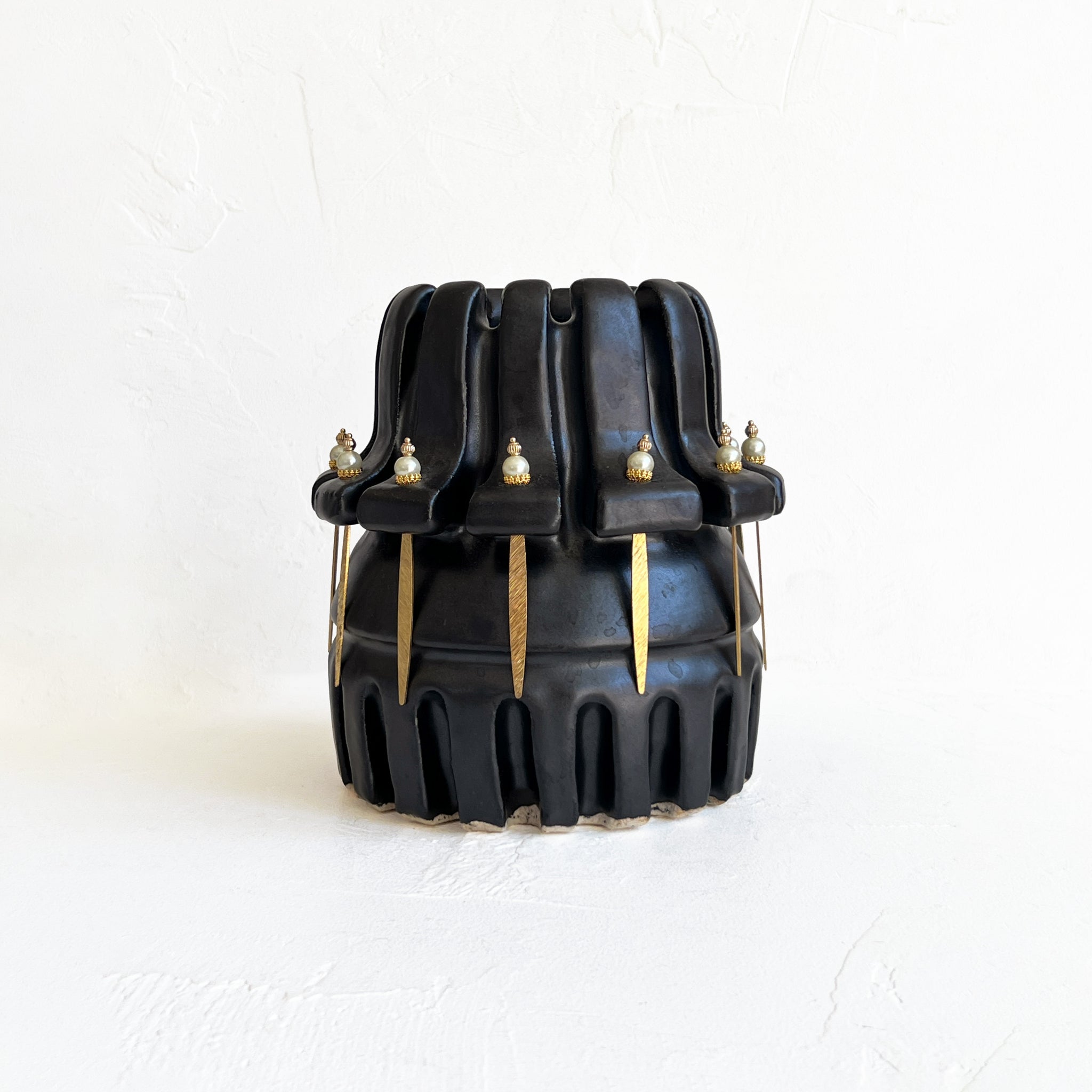Sleek black, carved vase, featuring a glazed interior that perfectly holds both fresh and dried floral arrangements. This unique piece is not just a vase; it’s a versatile statement item! Accented with removable pearl and brass jewelry, you can effortlessly transform its look to suit any occasion.