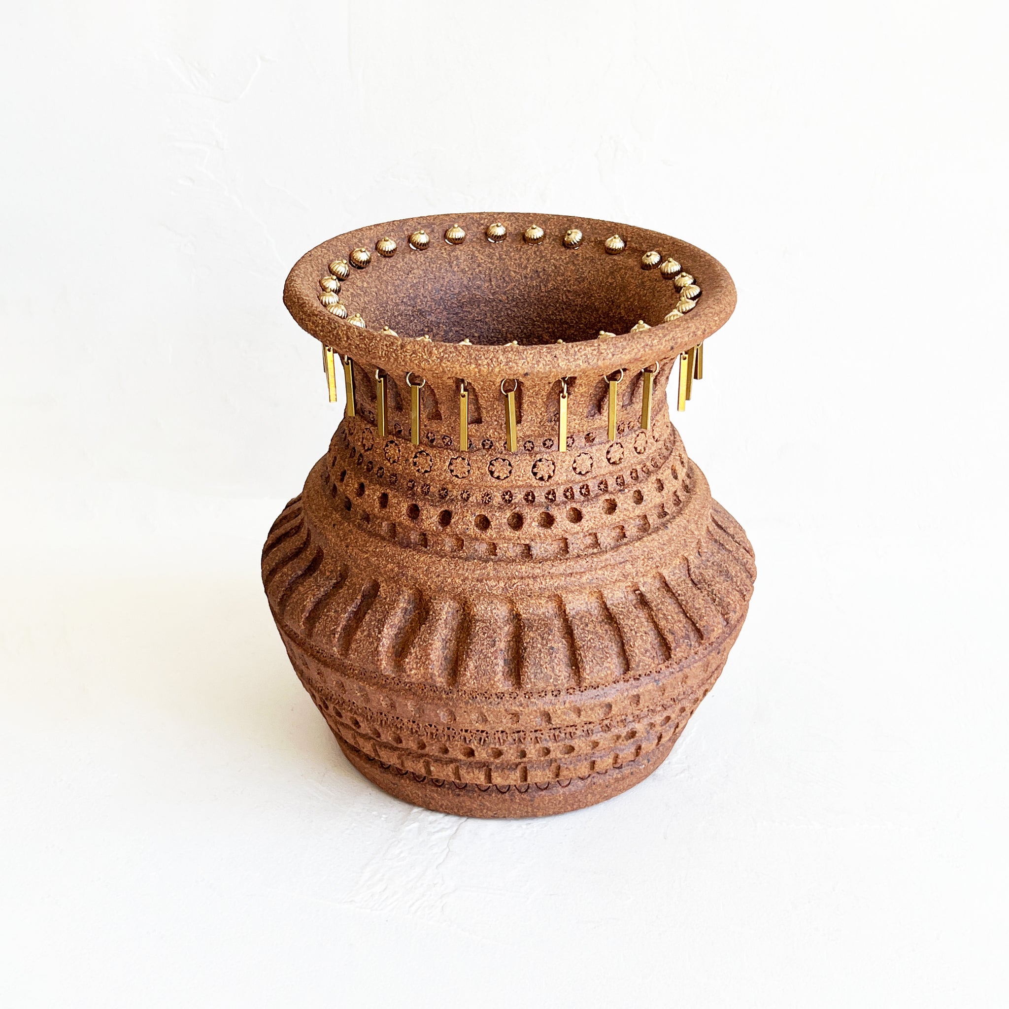 Red stoneware vase with intricate carved etchings in various patterns. The vase features removable brass jewelry and is truly a statement piece.