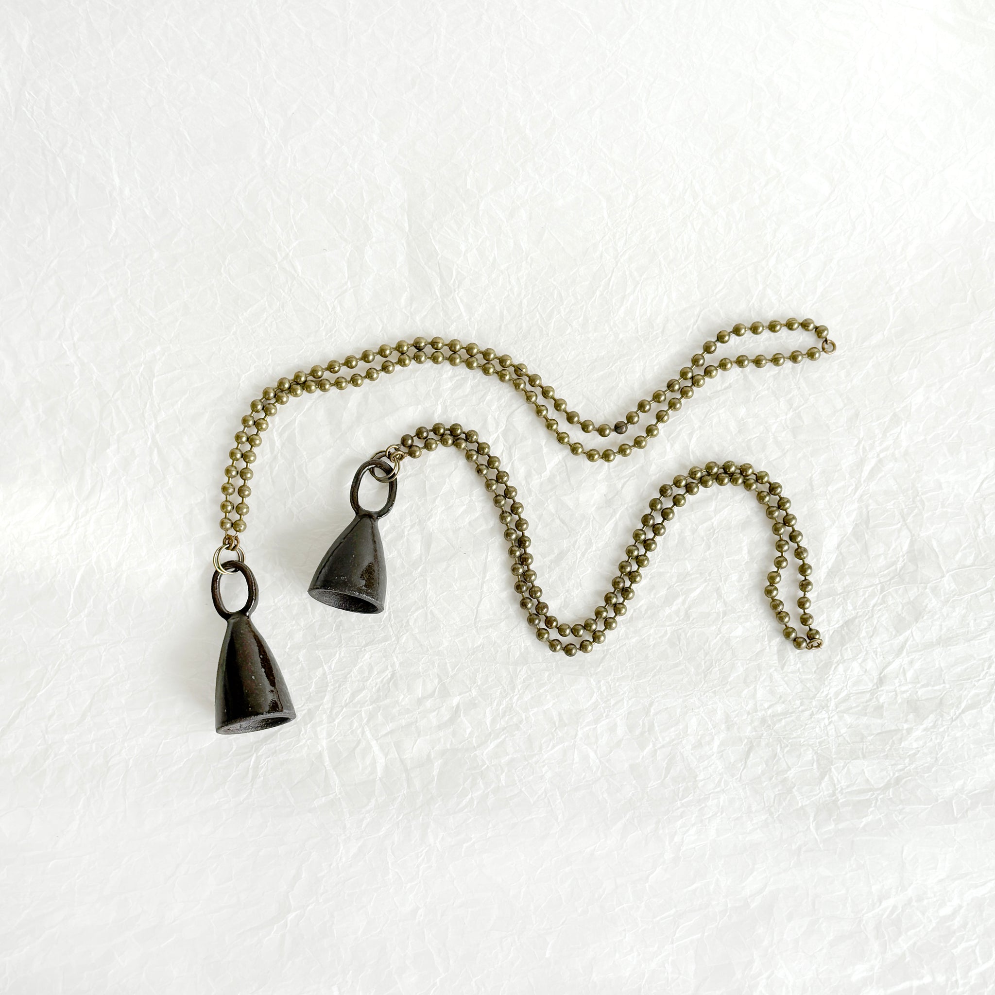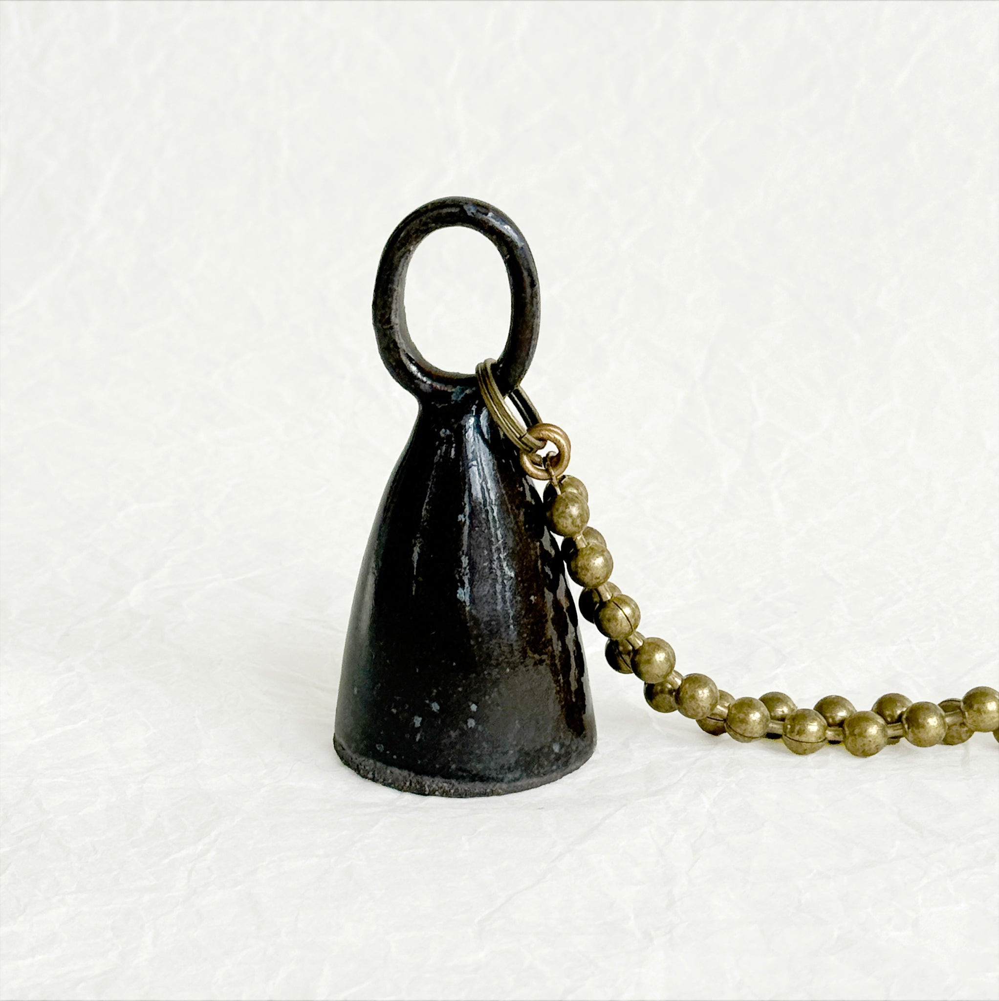 Bell shaped ceramic candle snuffer with a vintage brass ball chain, ideal for extinguishing taper and jar candles with style! The ceramic bell is wheel-thrown and glazed in a custom smokey quartz glaze.