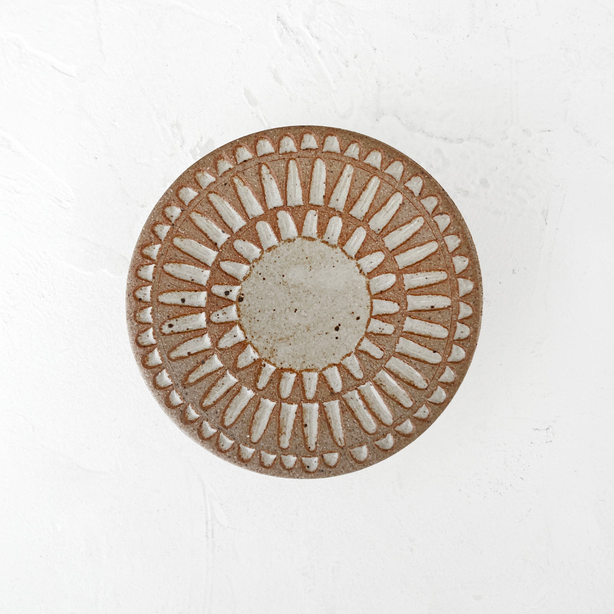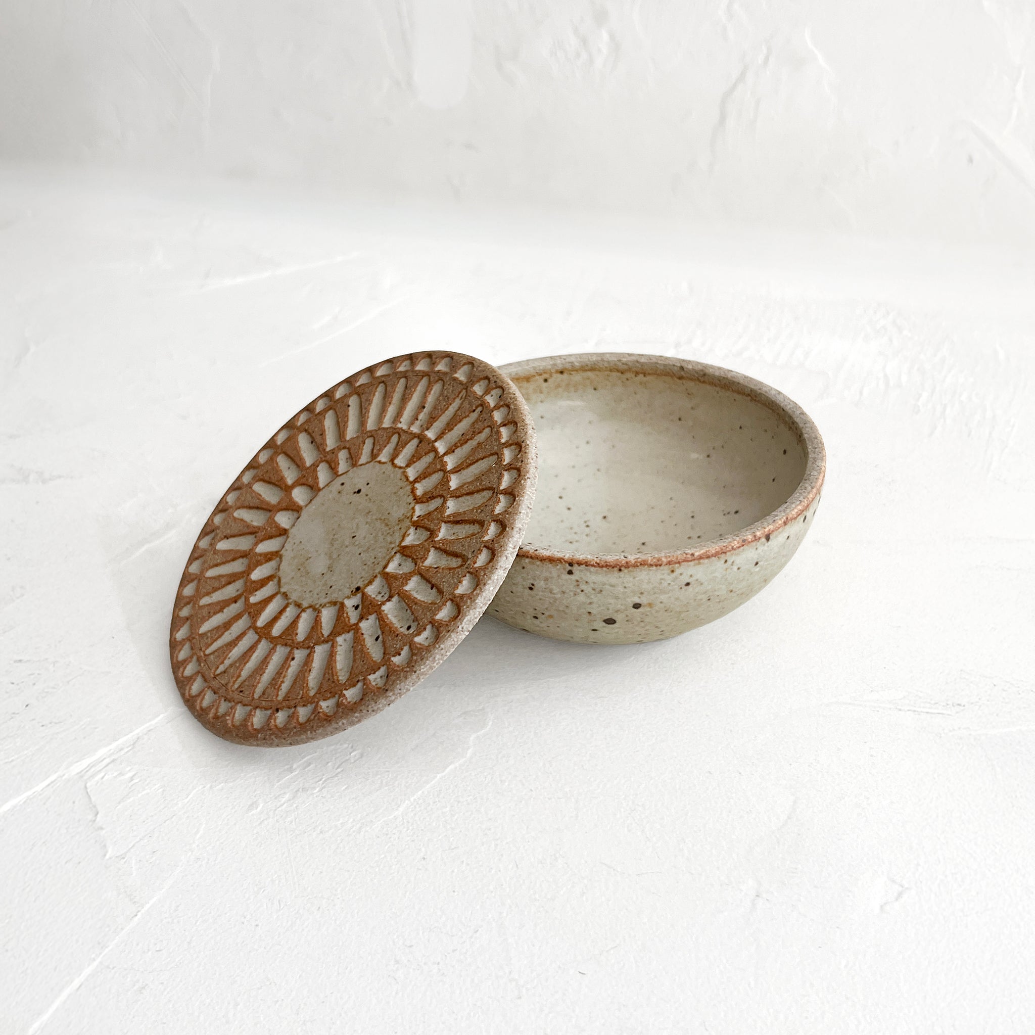 Wheel thrown and hand carved lidded bowl. White stoneware glazed in a matte white with speckling throughout. The perfect small storage solution.