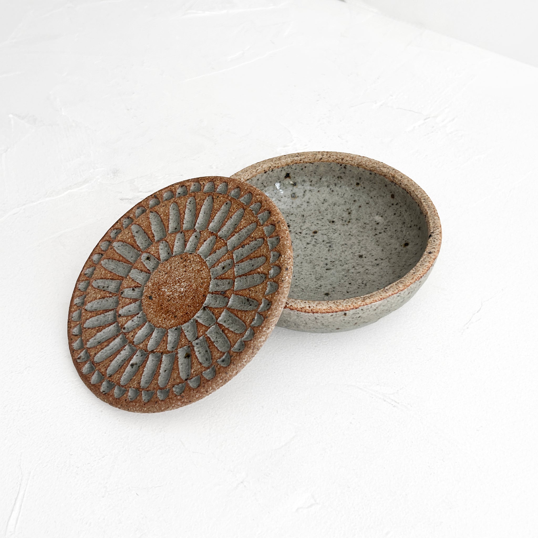 Wheel thrown and hand carved lidded bowl. Sandy tan stoneware glazed in a glossy blue with speckling throughout. The perfect small storage solution.