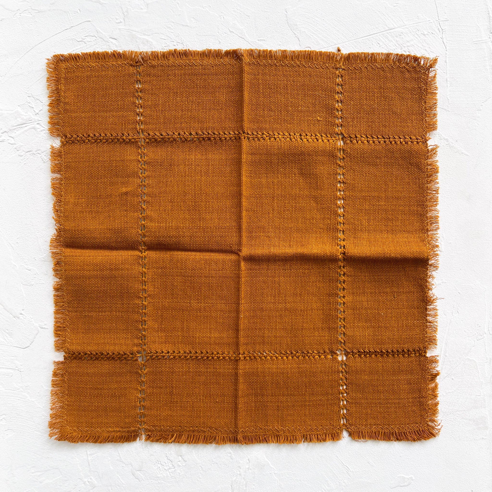 Cotton napkins in a beautiful burnt orange, featuring a crochet block pattern with a fringe border. Sold as a pair.