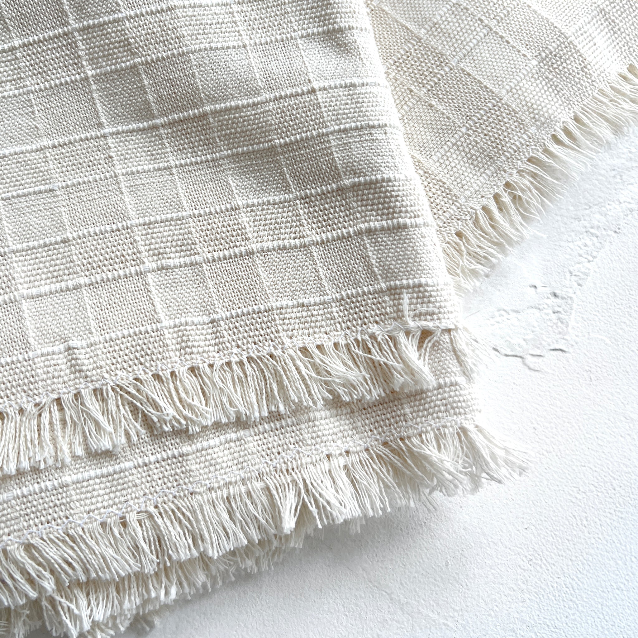 Cotton table runner in a soft cream, featuring a crochet plaid pattern with a fringe border. Hand woven in Mexico.