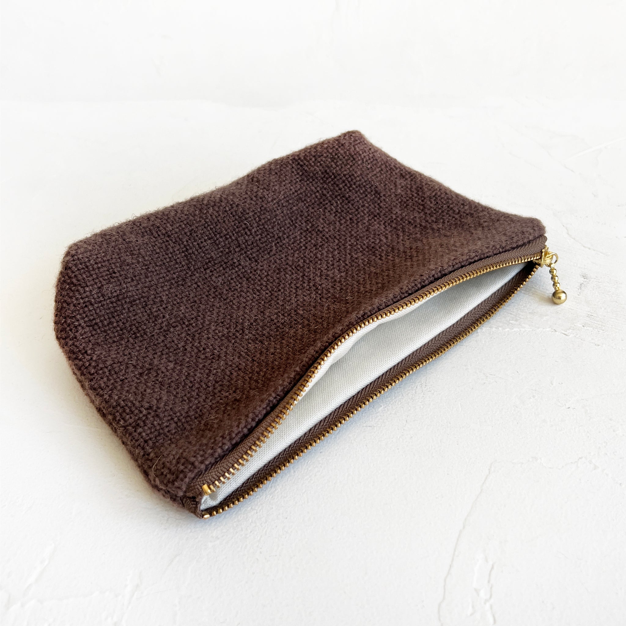 Textured handwoven pouch, beautifully dyed using natural plant and nut dyes, and complemented by durable brass hardware. With its undyed cotton lining, this pouch adds a touch of elegance and keeps your purse or travel bag perfectly organized.