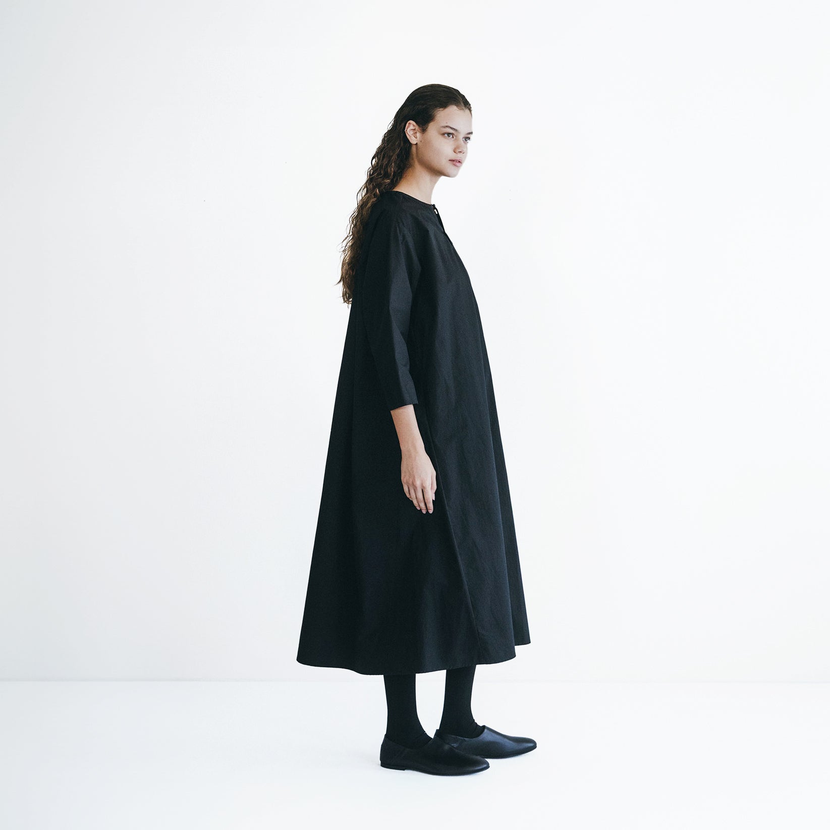 A full-length cotton dress with a flared A-line silhouette that gently sways as you move, creating a striking and feminine look. Two buttons at the front and a clean neckline add thoughtful design elements. Available in solid and fine stripe colorways, it is versatile for both polished and casual outfits with the right accessories.
