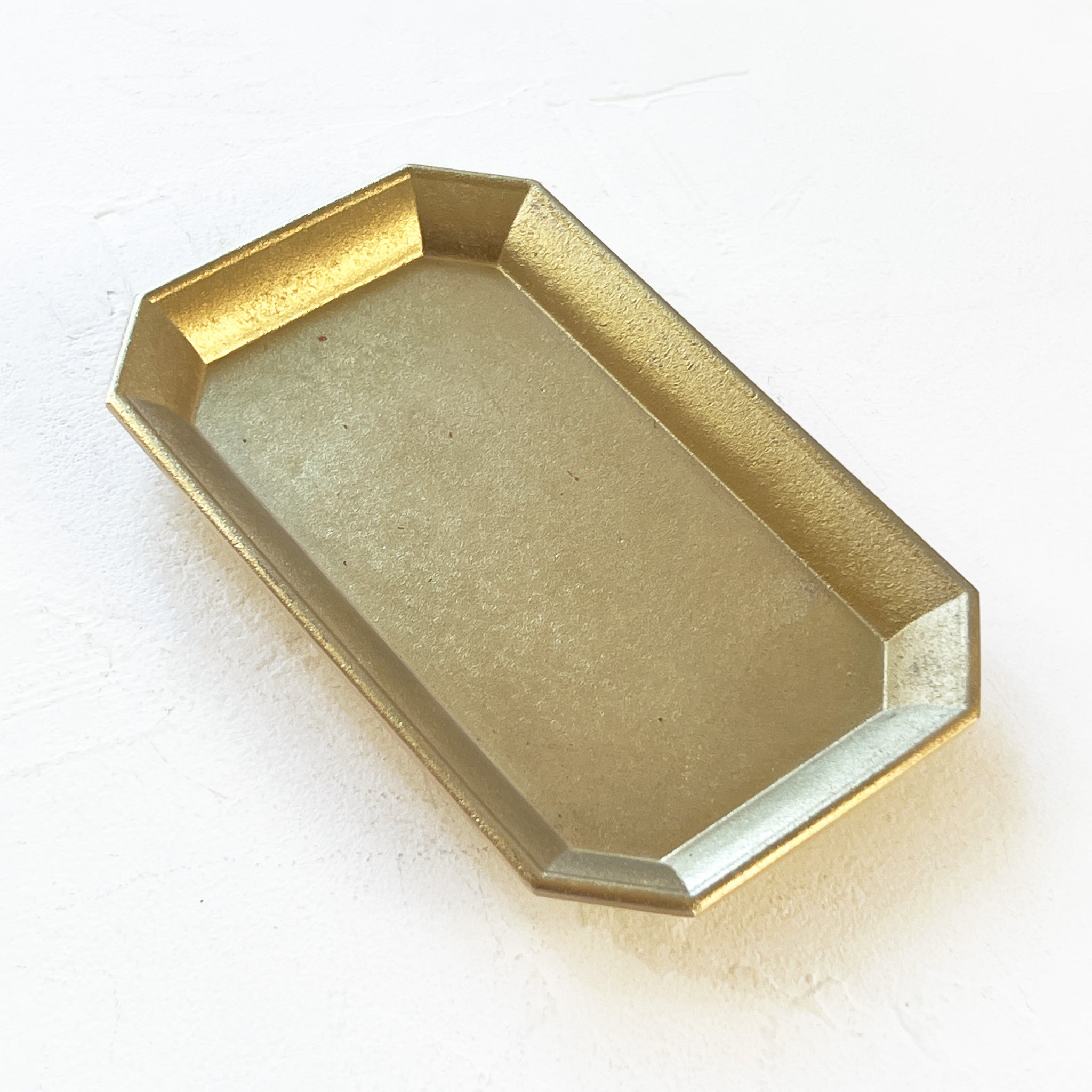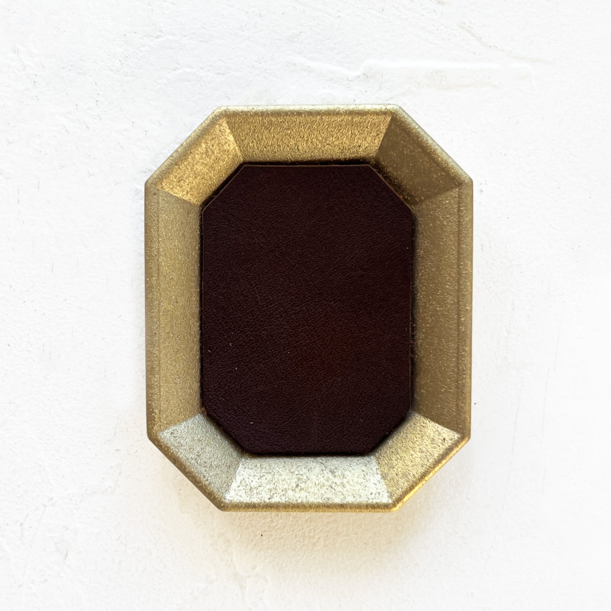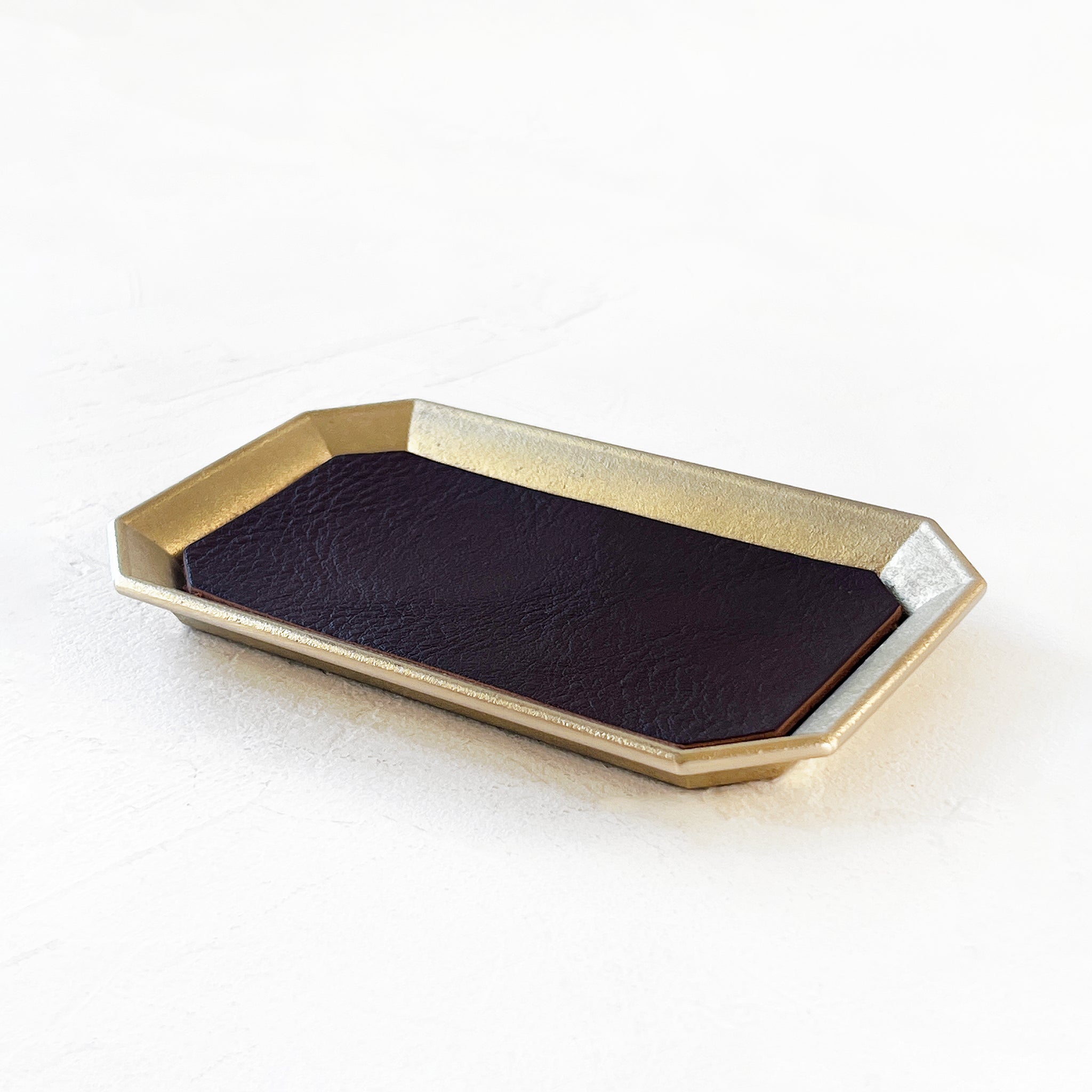 Two sizes of brass stationery trays with a crude casting surface. Can be used as trays for your favorite jewelry or small office supplies, such as erasers, paper clips, or small notes. The upper face of the tray is IHADA-finished, creating the crude casting surface. The tray gradually changes its color over the course of years due to oxidation. The longer it is used, the richer and subtler it becomes. For a special touch or to soften the tray, each tray comes with precision-cut leather tray pads. These leather pads are dyed in dark espresso brown and are sized to each tray.