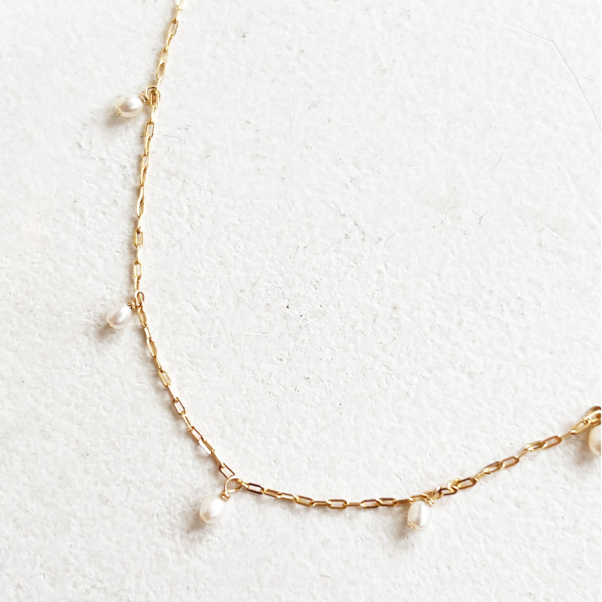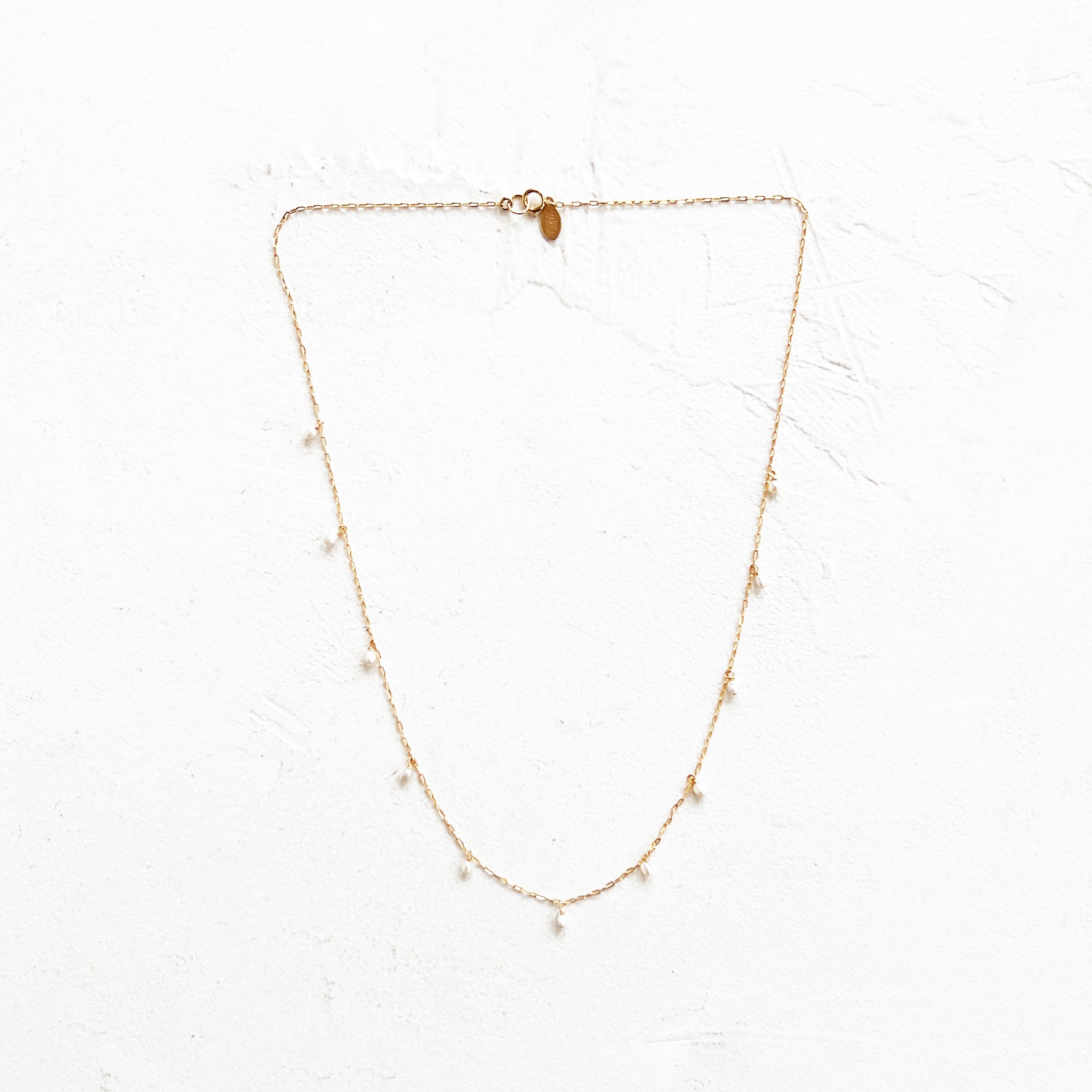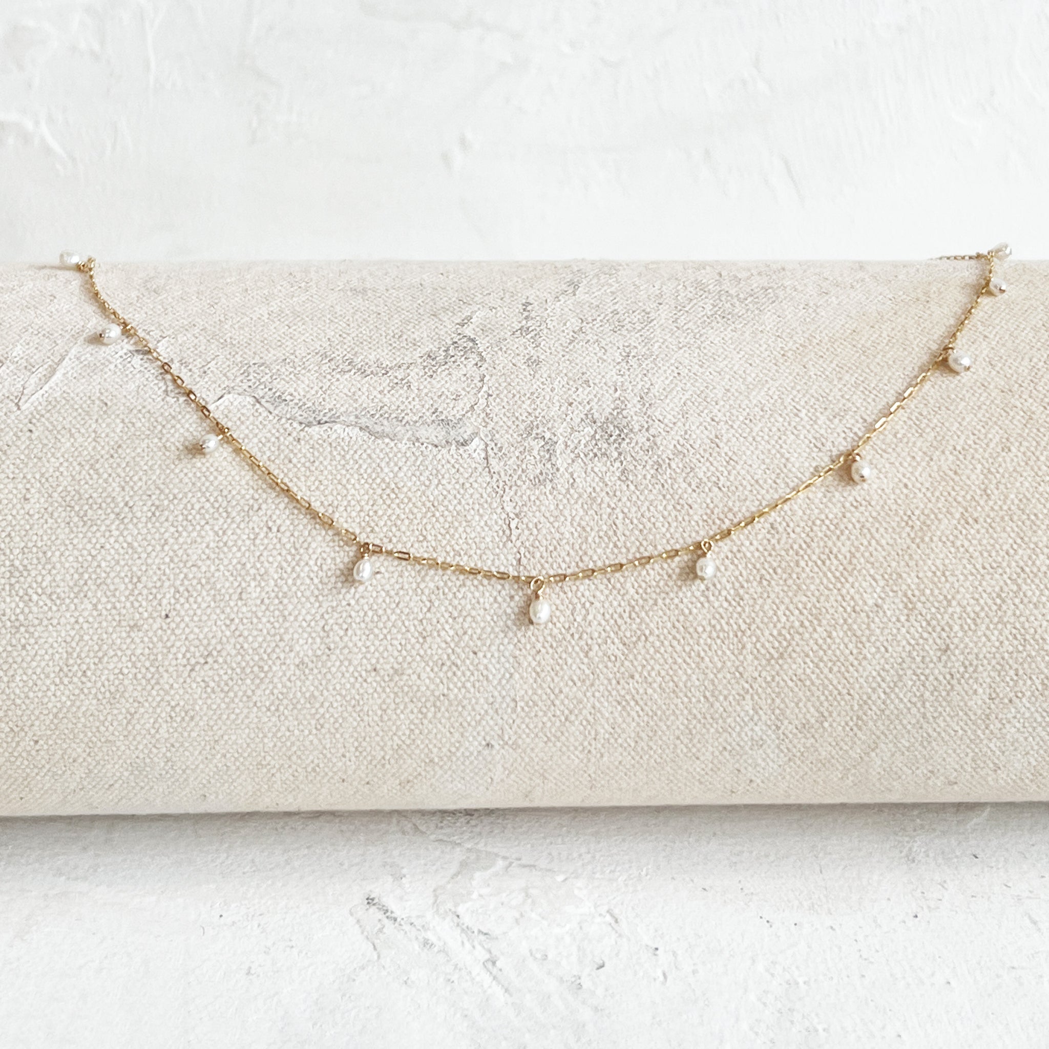 Freshwater seed pearls strung artfully on a smooth, 14k gold-filled cable chain. This 18-inch chain features a spring ring clasp closure.