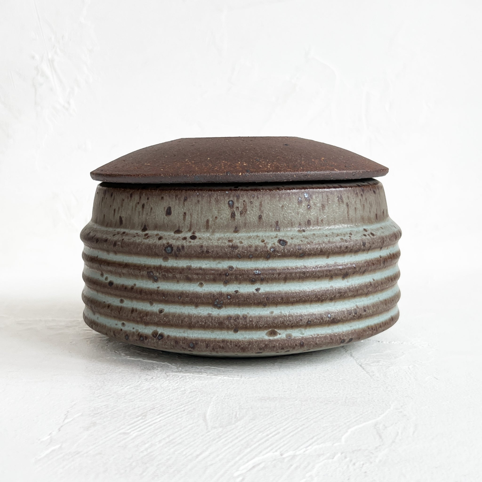 Handmade ceramic lidded vessel. Thrown in speckled blue stoneware with an unglazed, chocolate-brown-colored lid.