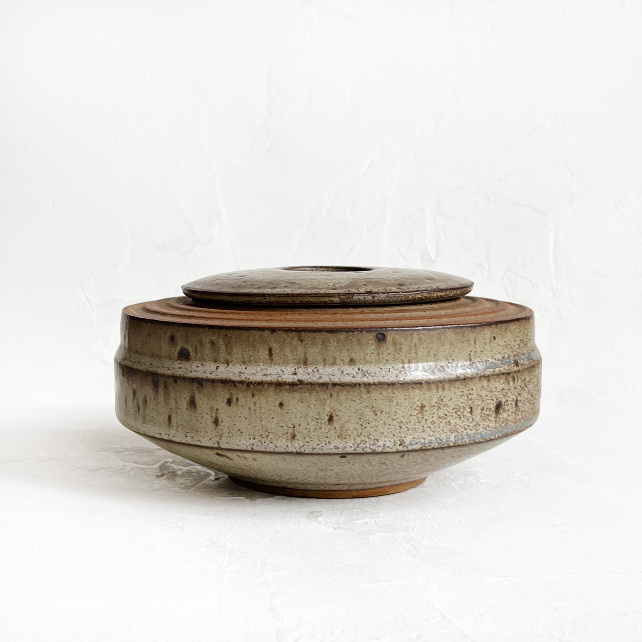 Handmade ceramic lidded vessel in an earthy olive color with light speckling throughout. It is thrown in brown stoneware, featuring an unglazed, ribbed top on the upper base and a glazed lid.