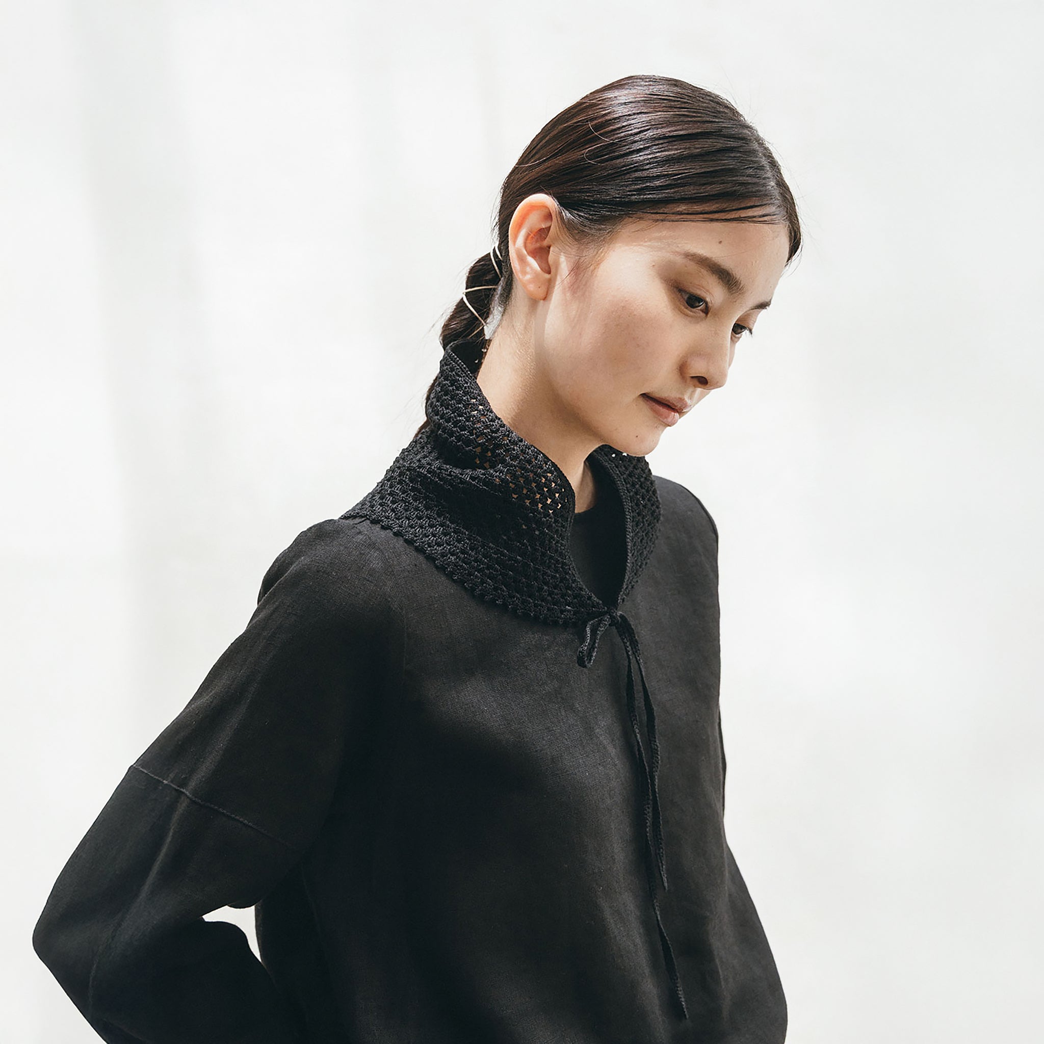 Delicately hand-knitted in Lithuania from linen yarn, this lightweight scarf is versatile and stylish. Drape it over your shoulders like a collar or wrap it around your head as a bandana for a natural, effortless look. It adds a refined accent to any outfit and is available in easy-to-style black and natural tones. Each piece is hand-crafted, celebrating the charm of slow fashion and thoughtful detail.