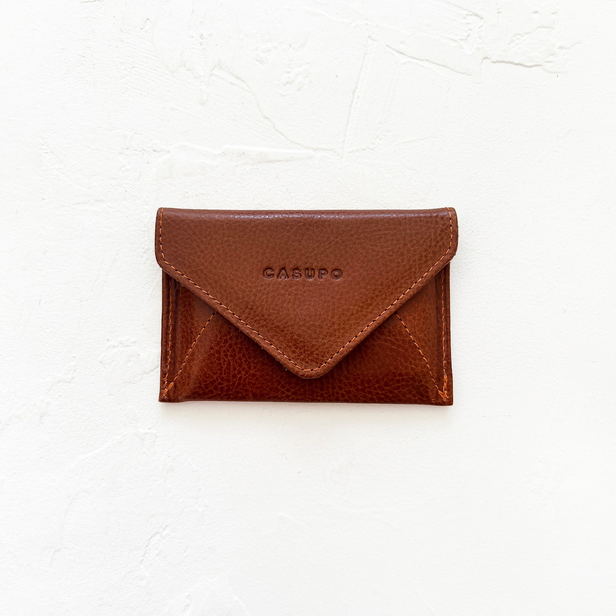This compact envelope card holder is designed to store all your cards and cash in one place securely. It features a full-grain leather exterior with brown suede lining and a hidden snap closure. The wallet can accommodate over 20 business cards, 12 credit cards, or cash folded in half.