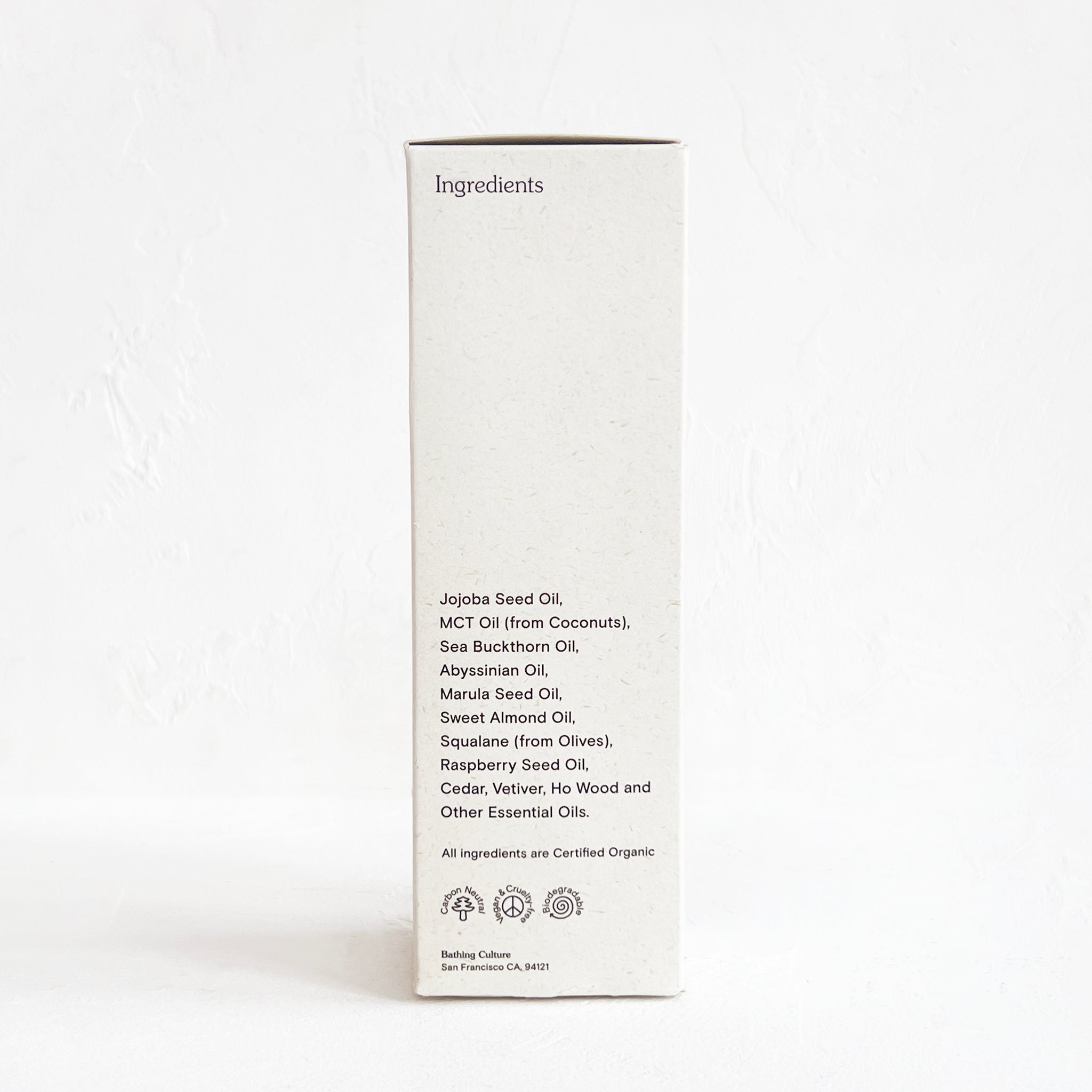 Ingredients: Organic Simmondsia Chinensis (Jojoba) Seed Oil, Organic Caprylic/Capric Triglyceride (MCT Oil), Organic Sclerocarya Birrea (Sea Buckthorn) Seed Oil, Organic Crambe Abyssinica (Abyssinian) Seed Oil, Organic Prunus Amygdalus Dulcis (Sweet Almond) Oil, Fragrance (Essential Oil Blend), Organic Hippophae Rhamnoides (Marula) Seed Oil, Squalane (Olive Oil), Organic Rubus Idaeus (Raspberry) Seed Oil