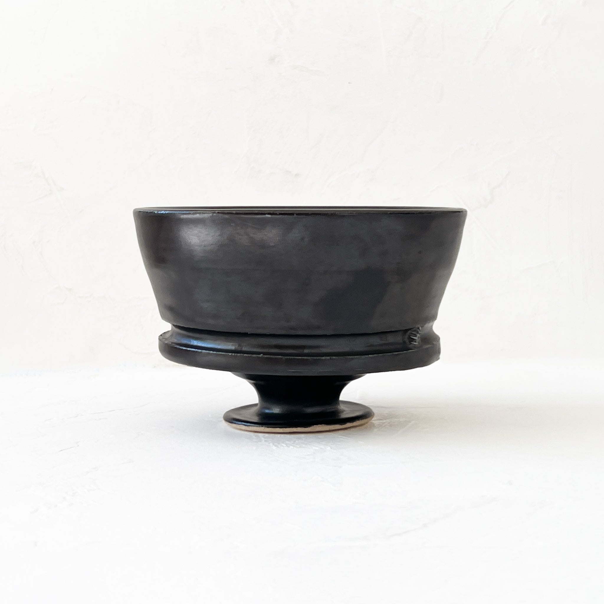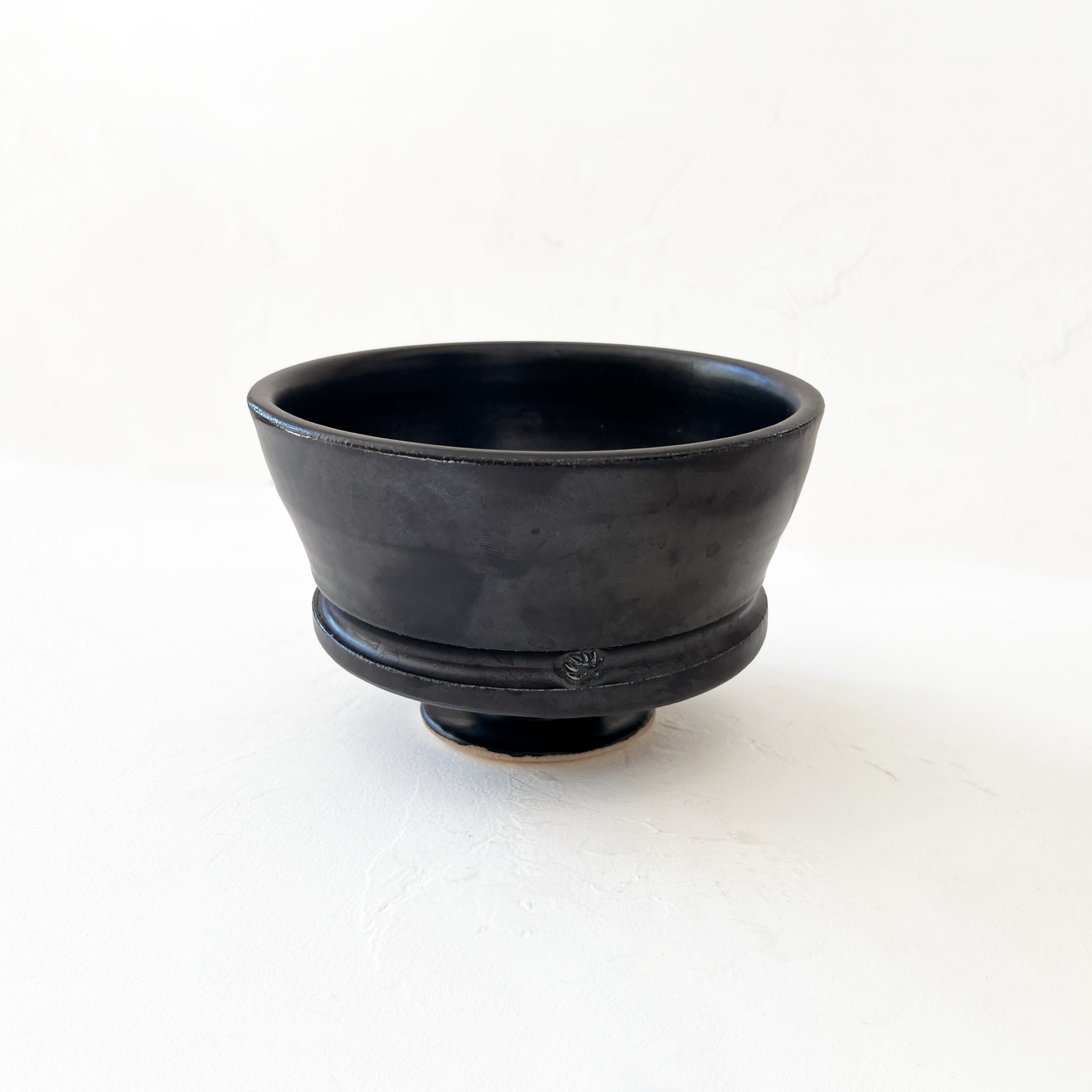 Matte black bowl with a raised base and a subtle decorative trim. Perfect for holding your fresh fruit and vegetables on your counter.