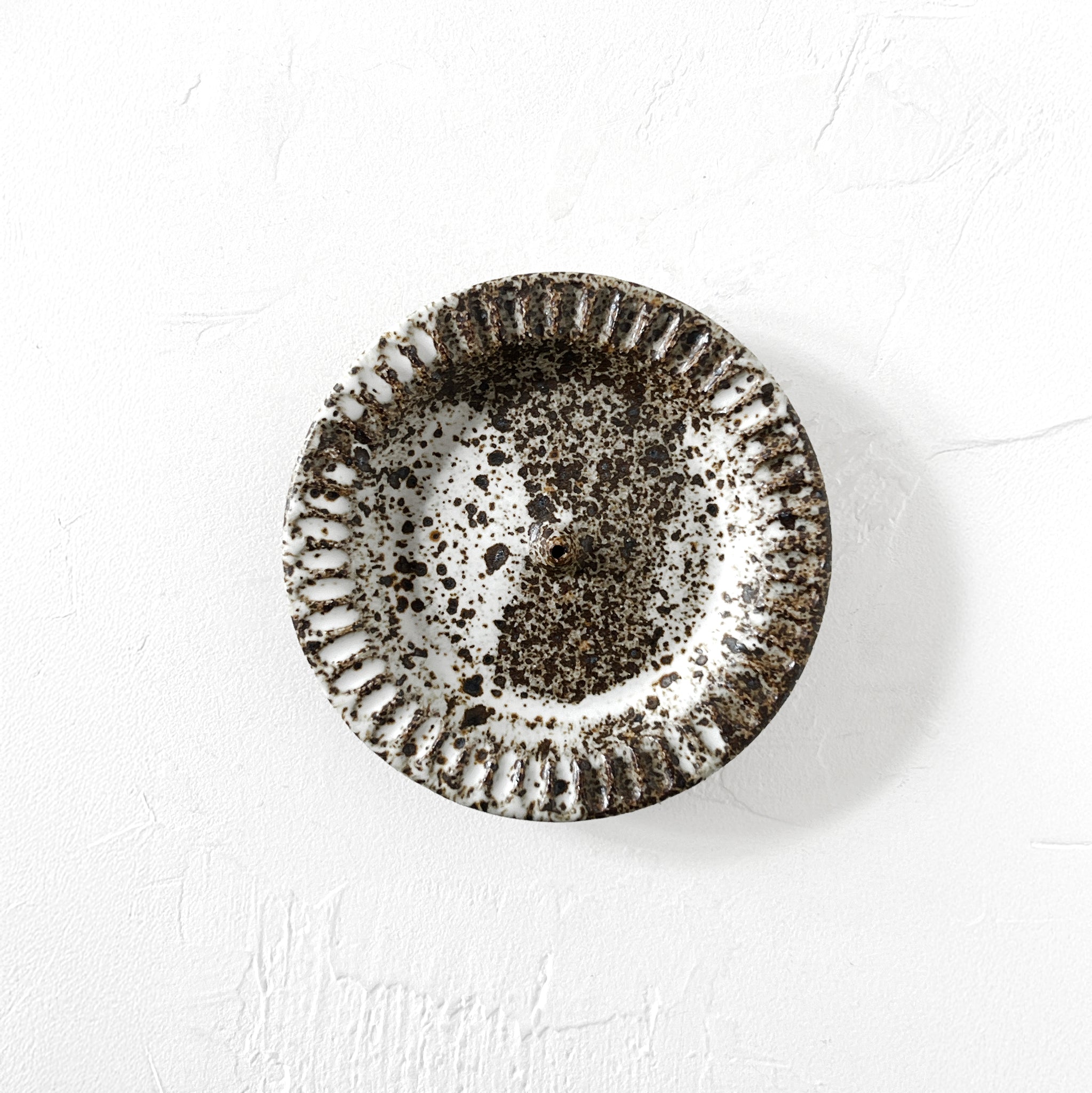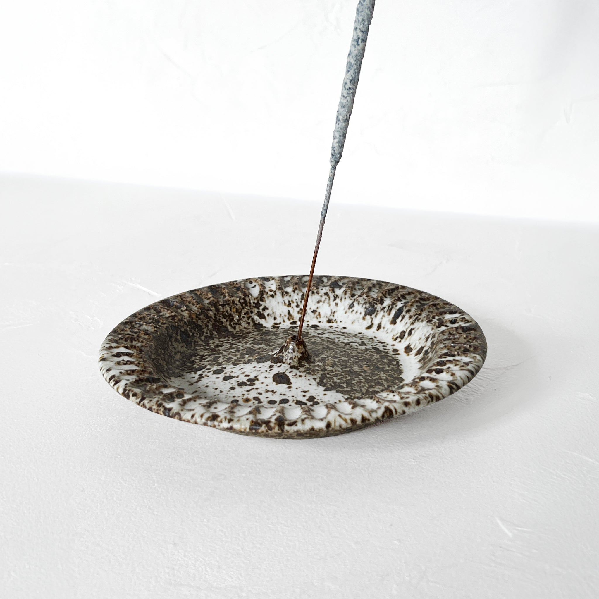 Wheel-thrown small incense dish in an earthy olive and warm white with lots of speckling throughout.