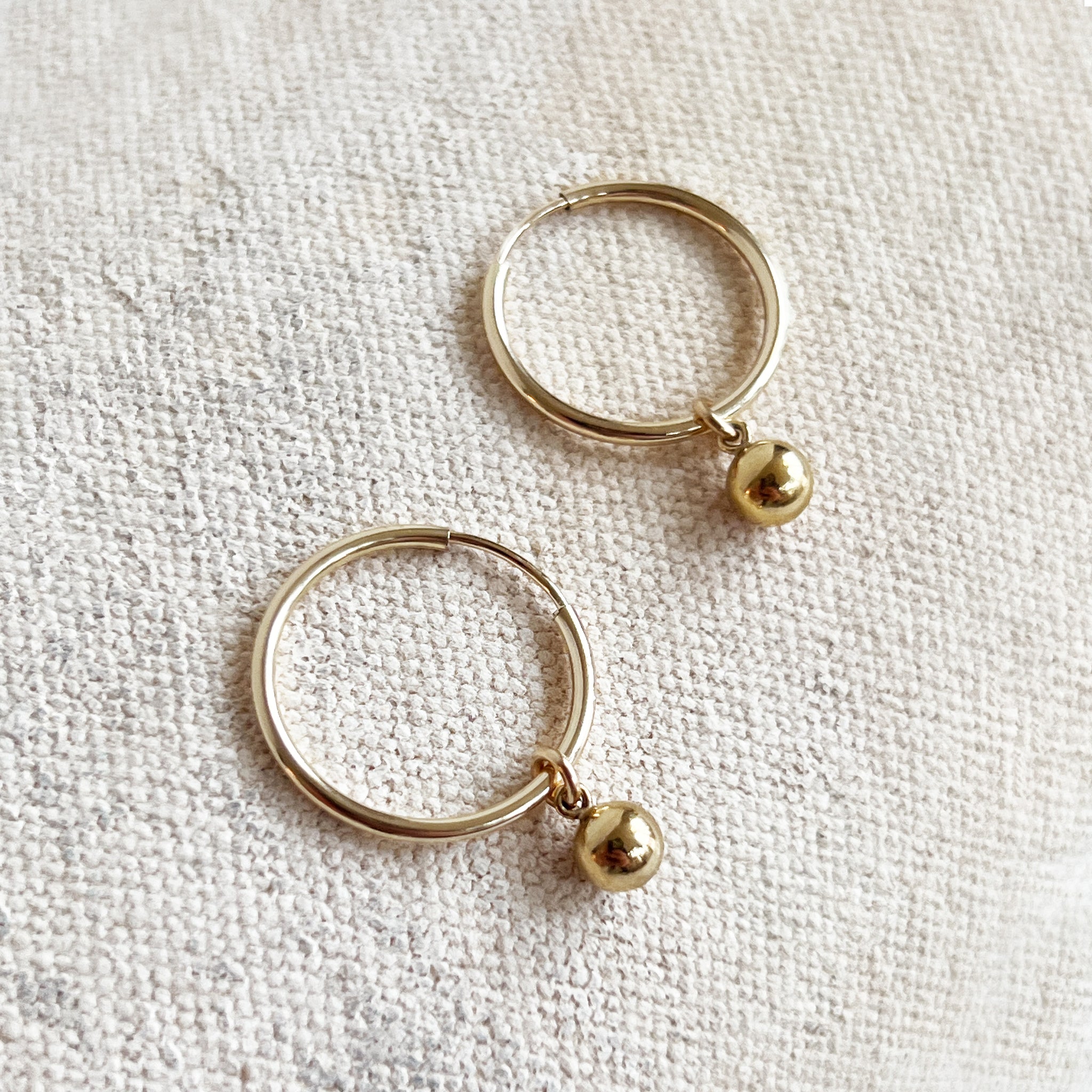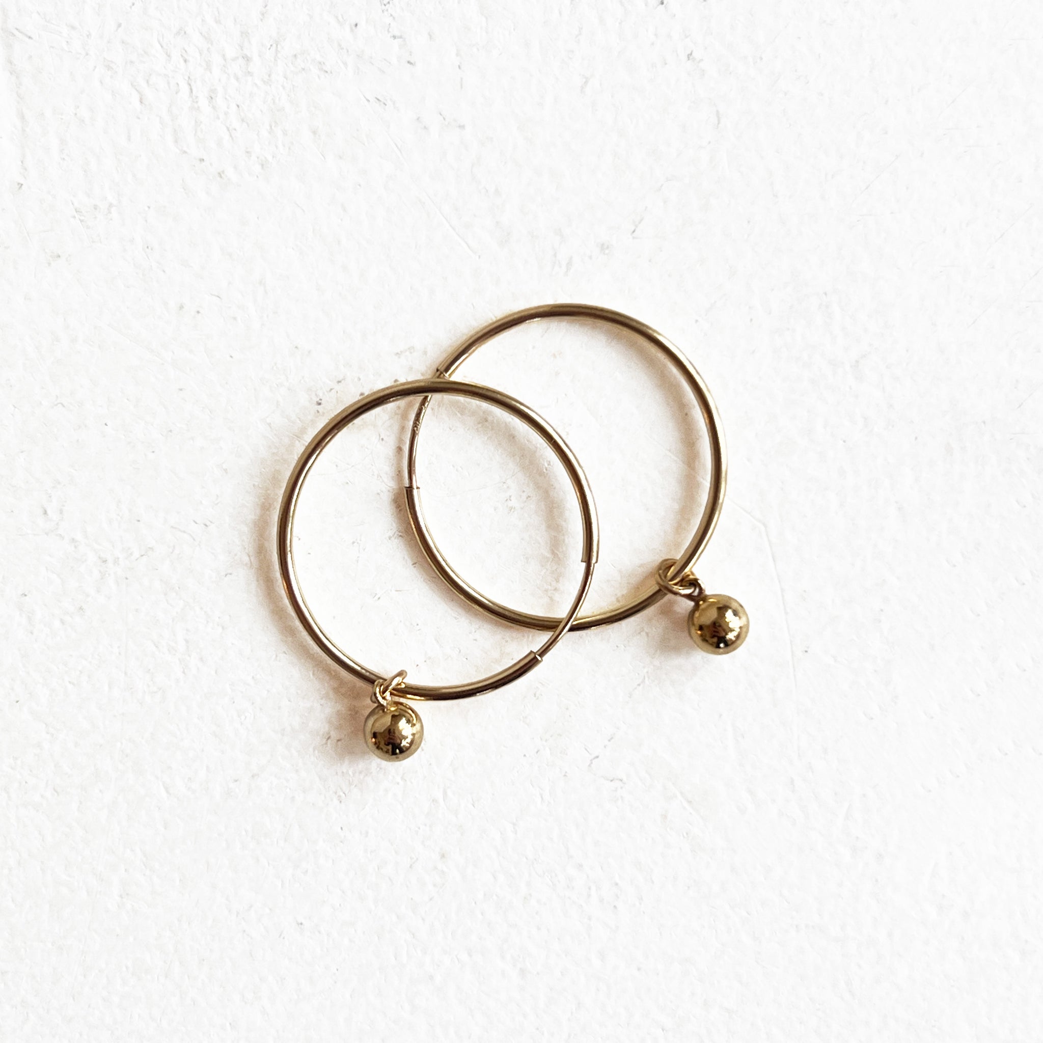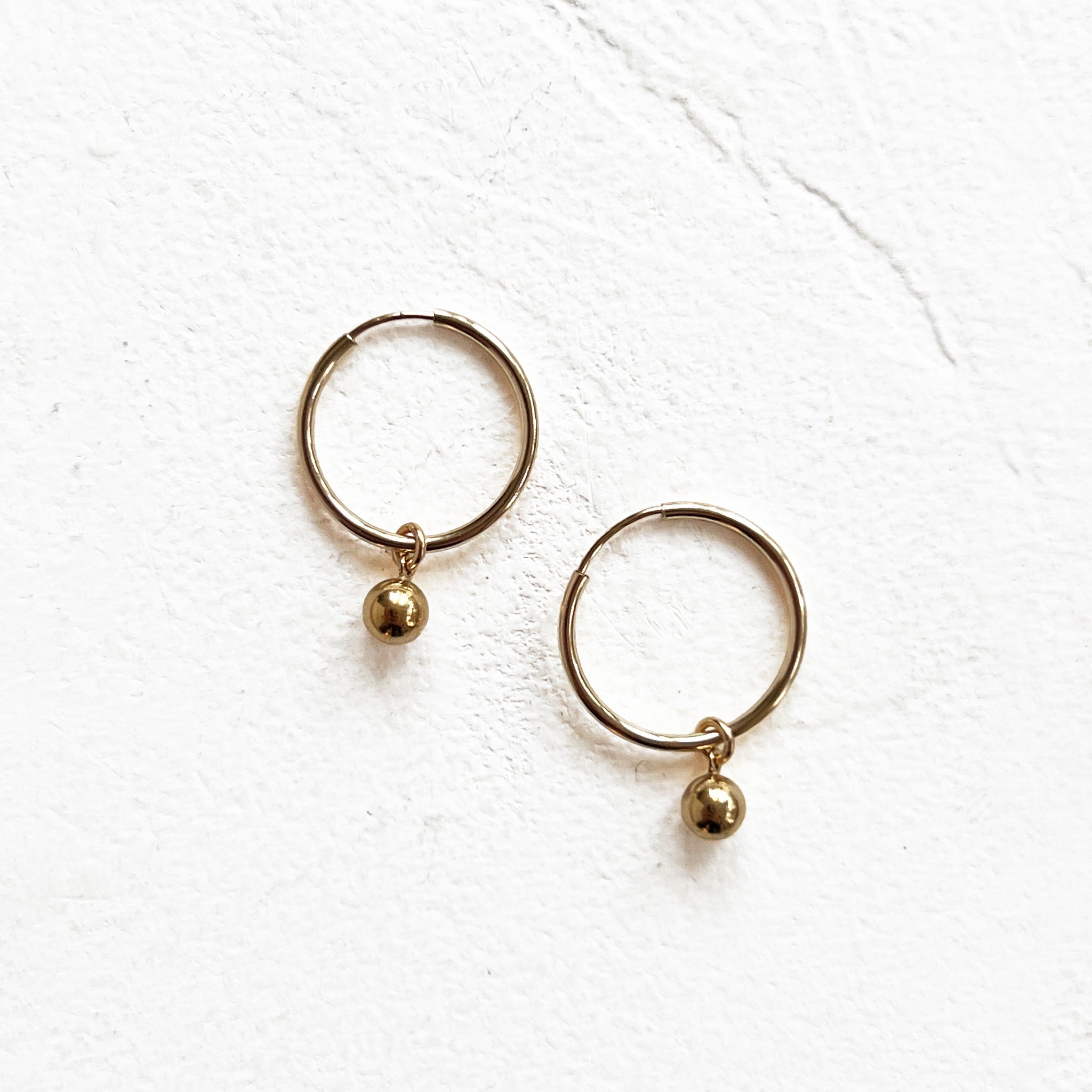 5mm ball drop earrings on seamless hoops, made with 14k gold filled. The everyday earrings that literally go with anything! Comes in two sizes.