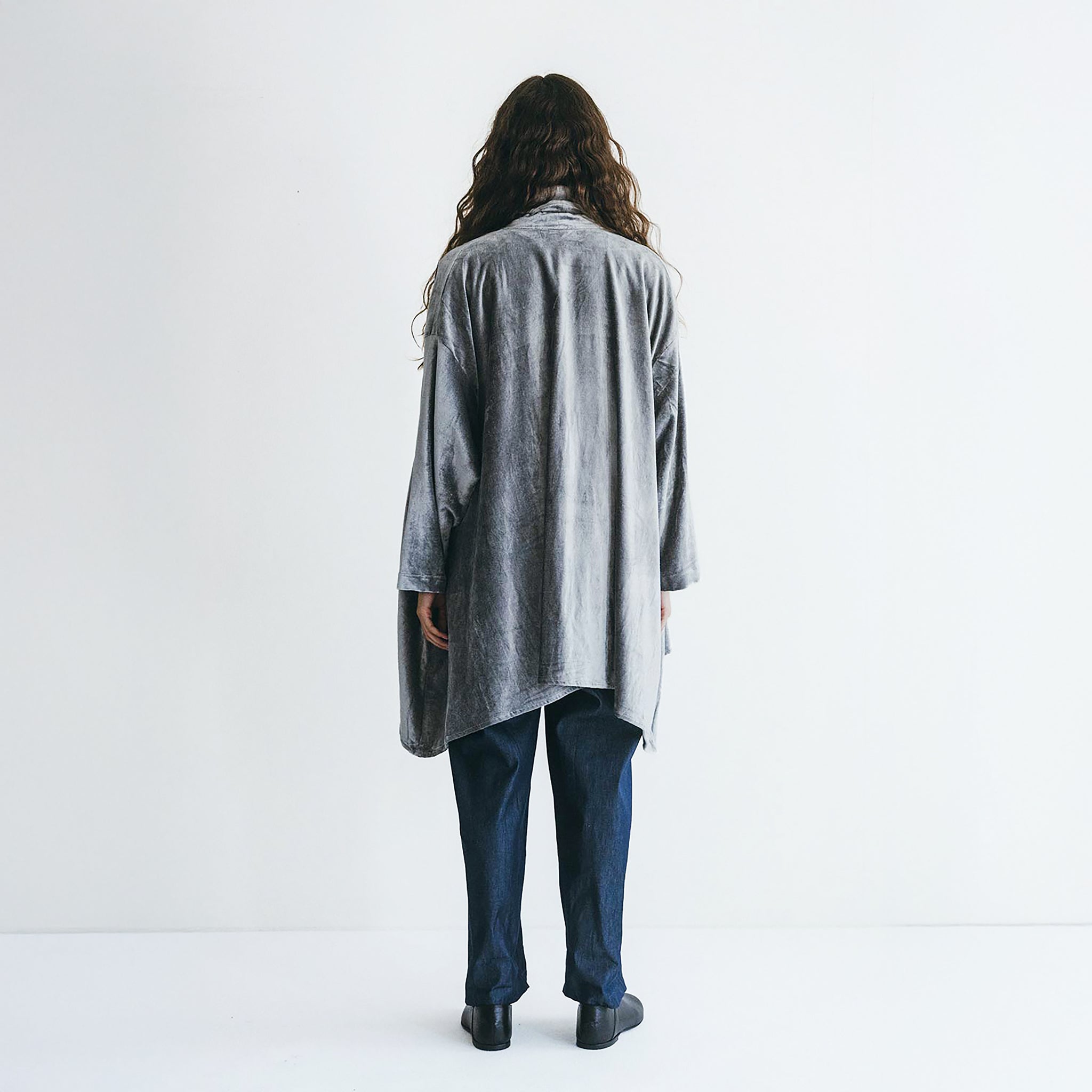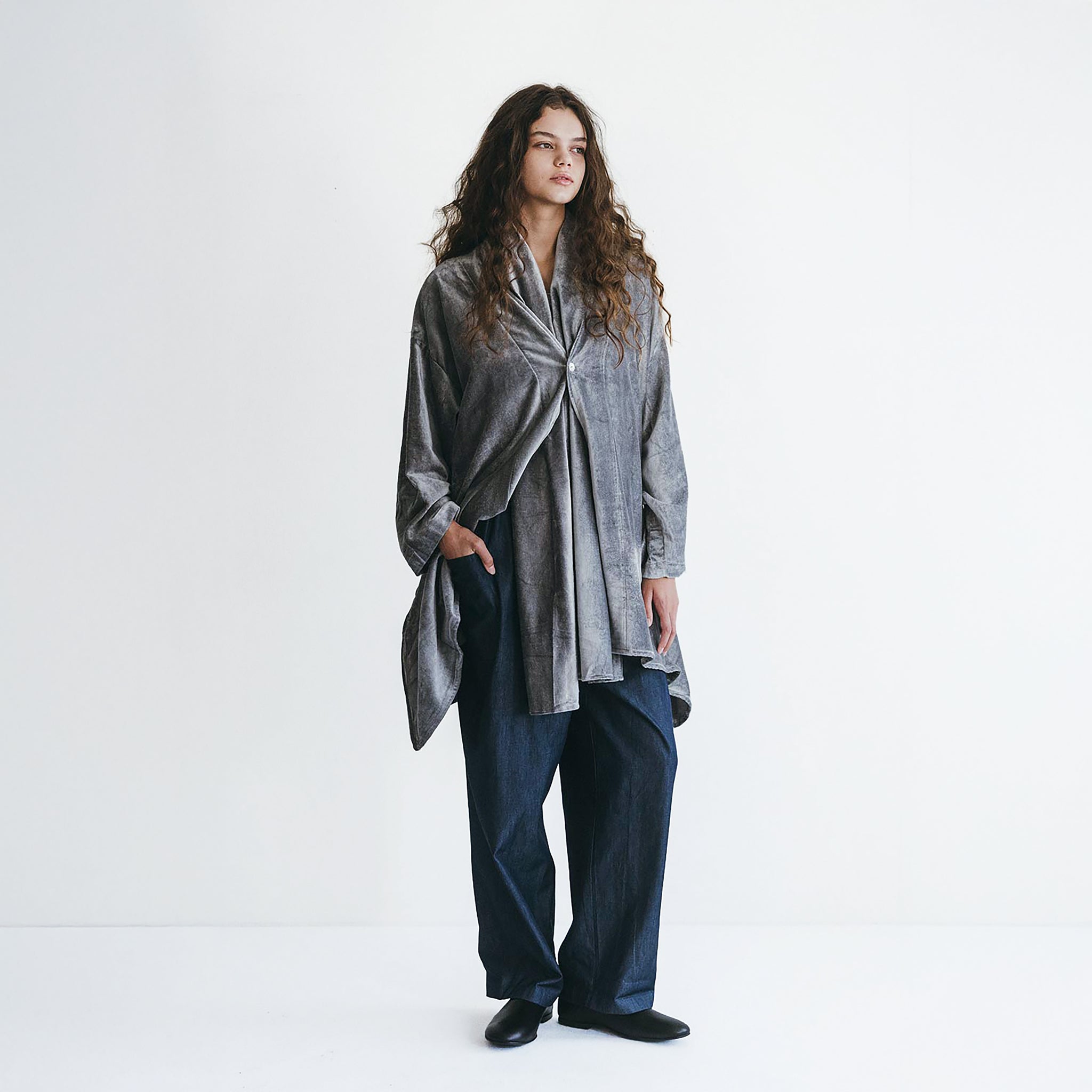 A standout coat crafted from glossy velour fabric, designed with an integrated stole for versatile styling. Wrap it loosely or tie it at the front to add nuance around the neck. The minimal front fastening with a single button and relaxed drop shoulders creates a laid-back yet polished look. Its knee-length design pairs well with pants or a dress. Pockets on both sides. 100% Viscose
