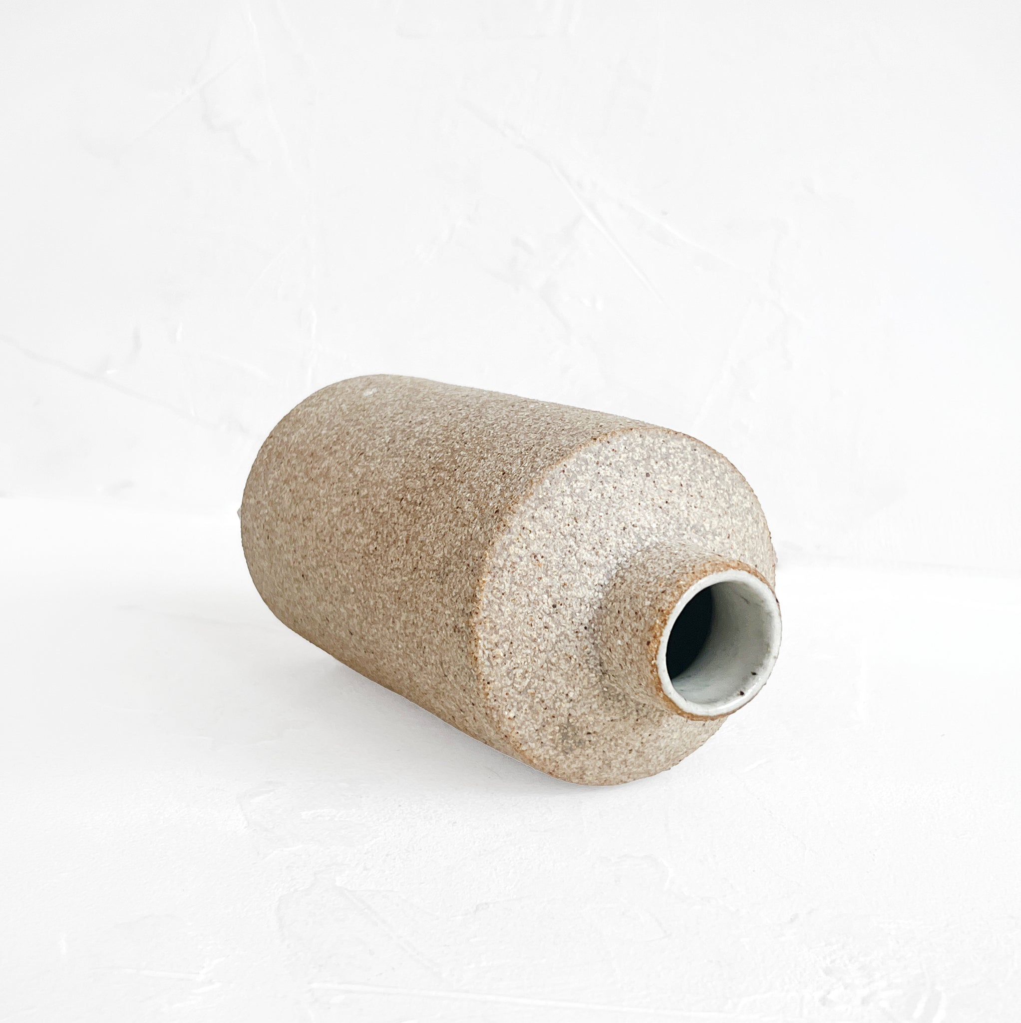 Unglazed bud vase made in an earthy clay with a textured finish. The interior is glazed, allowing for the use of either fresh or dried flowers.
