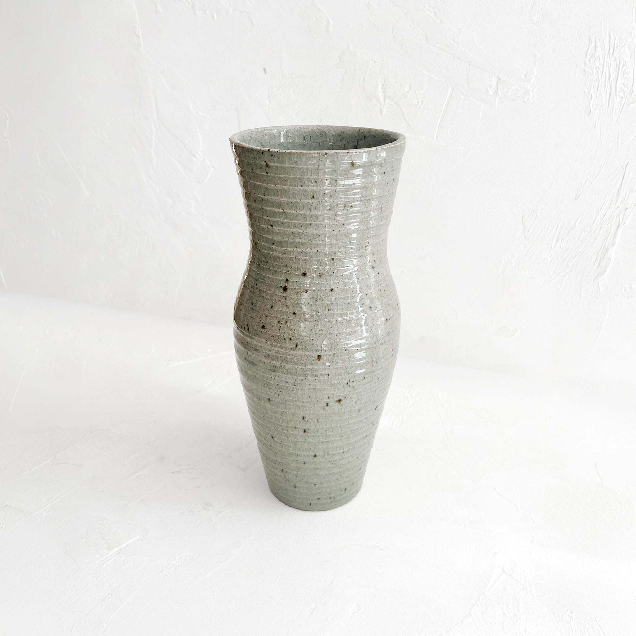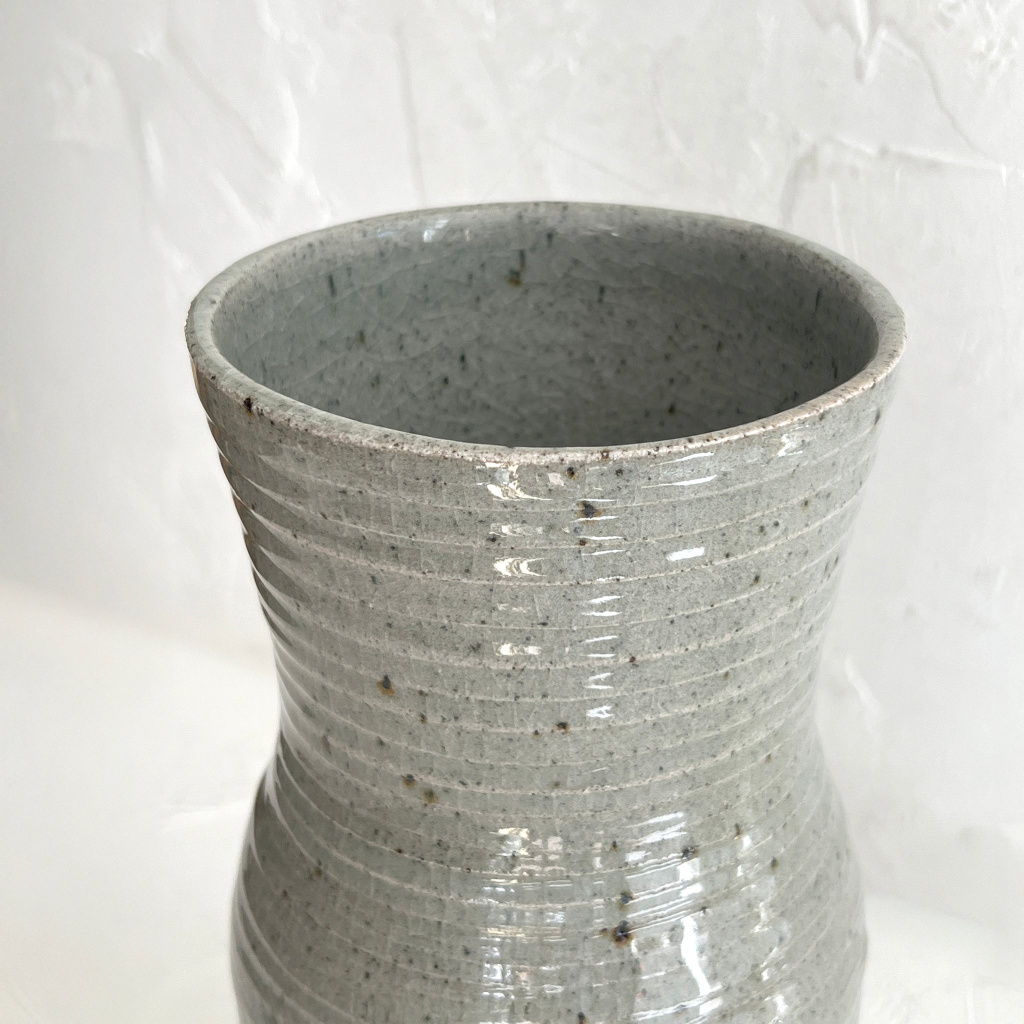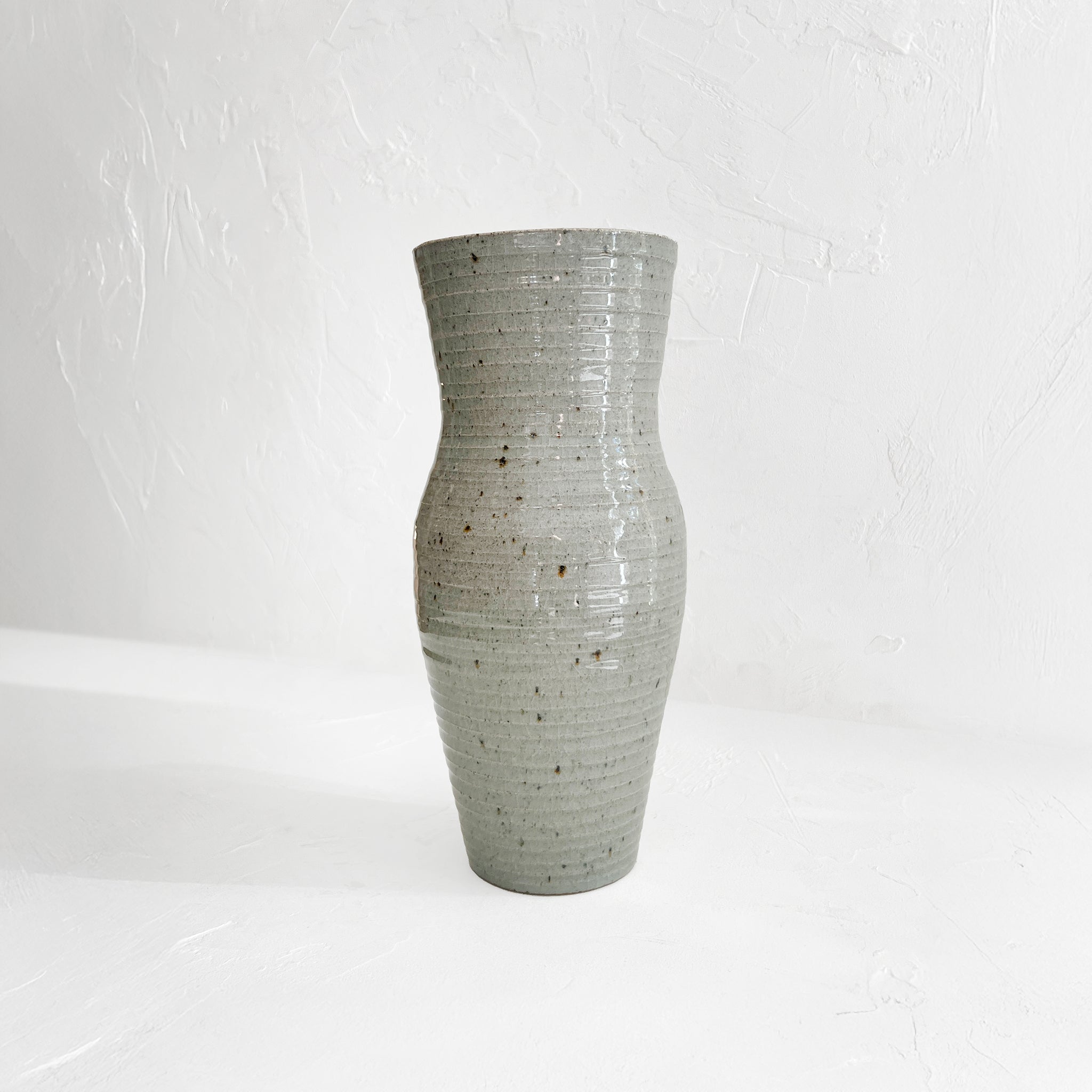 A tall vase with a subtle ribbed design, accentuated in a soft, glossy blue glaze with light speckles throughout.