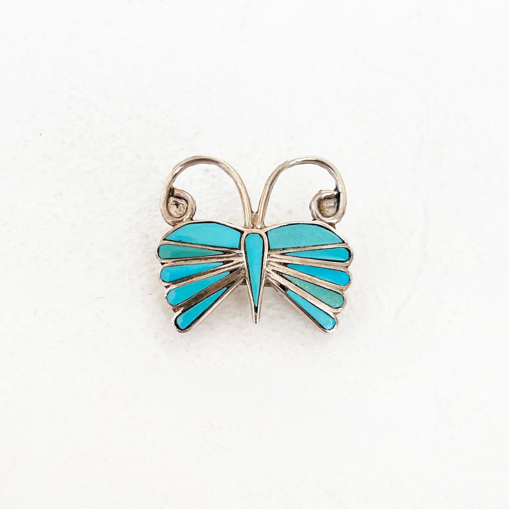 Handcrafted Native American Zuni butterfly pin by artist Edward Espanosa, made of sterling silver with turquoise inlay. In excellent vintage condition.