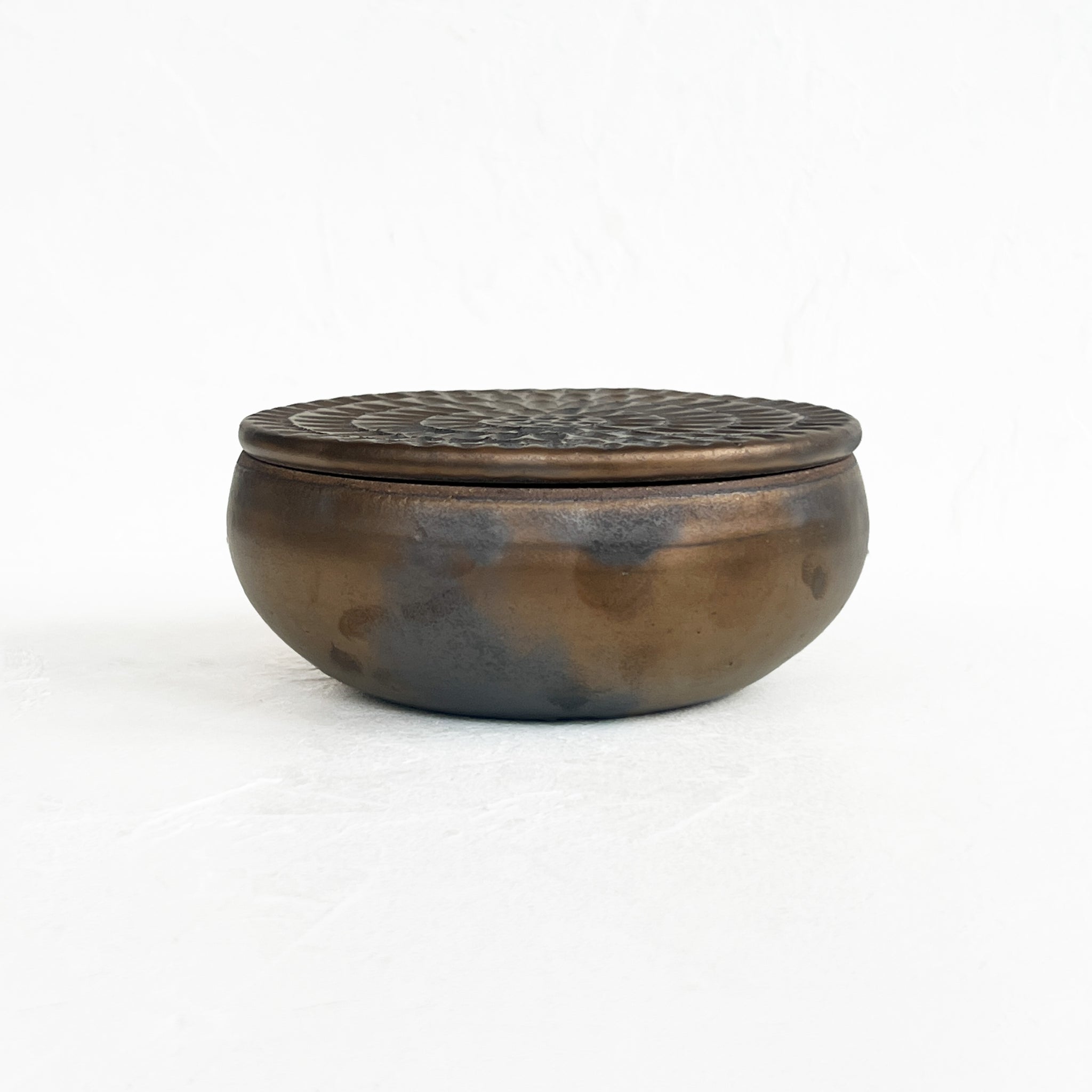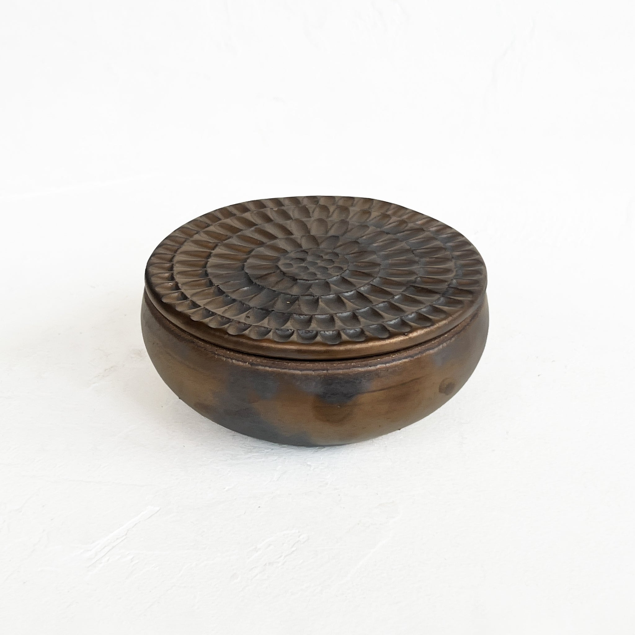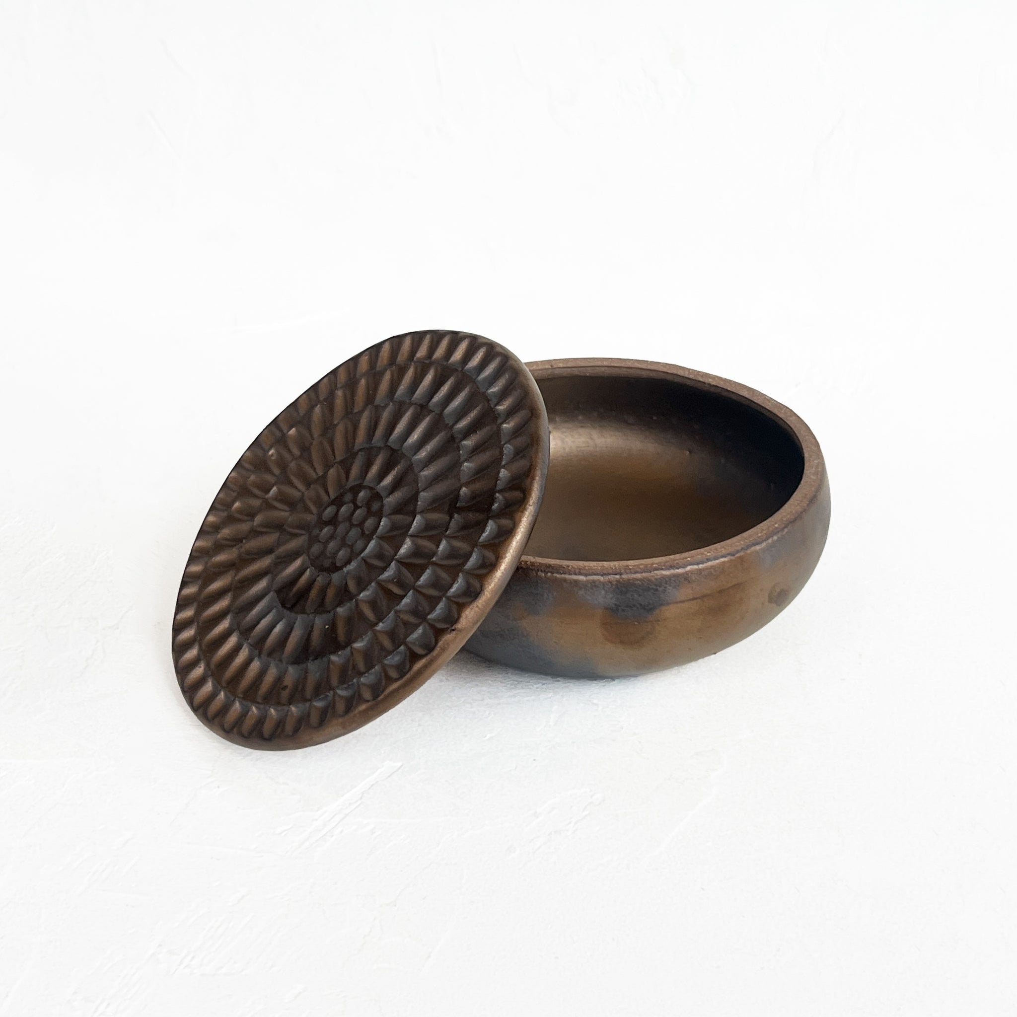 Lidded container with a beautifully textured lid; an ideal small storage solution for the kitchen or bathroom.
