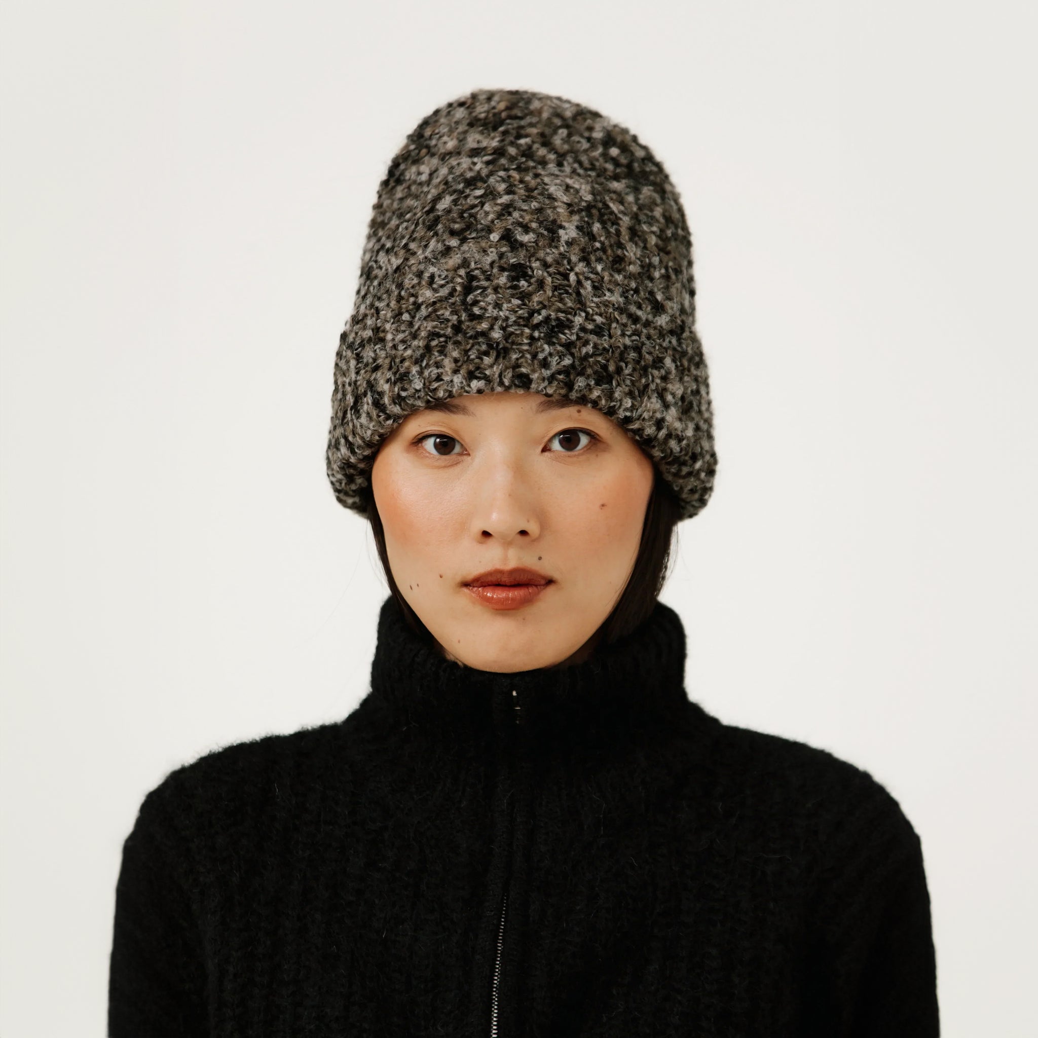 A cozy essential featuring a voluminous rib stitch and classic turn-up cuff. Crafted from soft, textured boucle alpaca, offering a lofty, cushioned feel and finished with seamless construction for a clean, comfortable fit.
