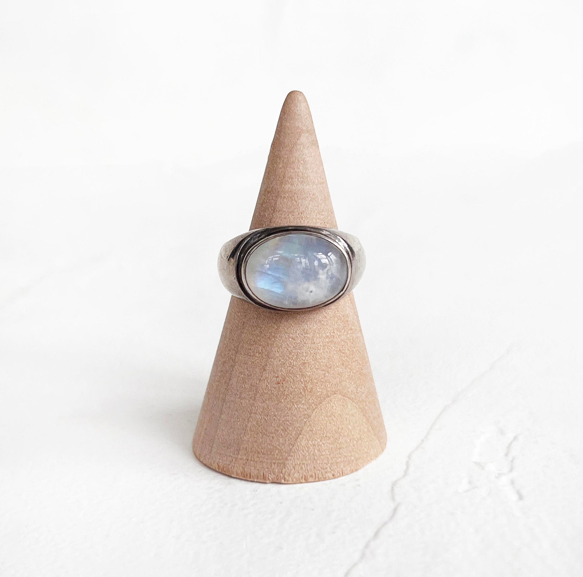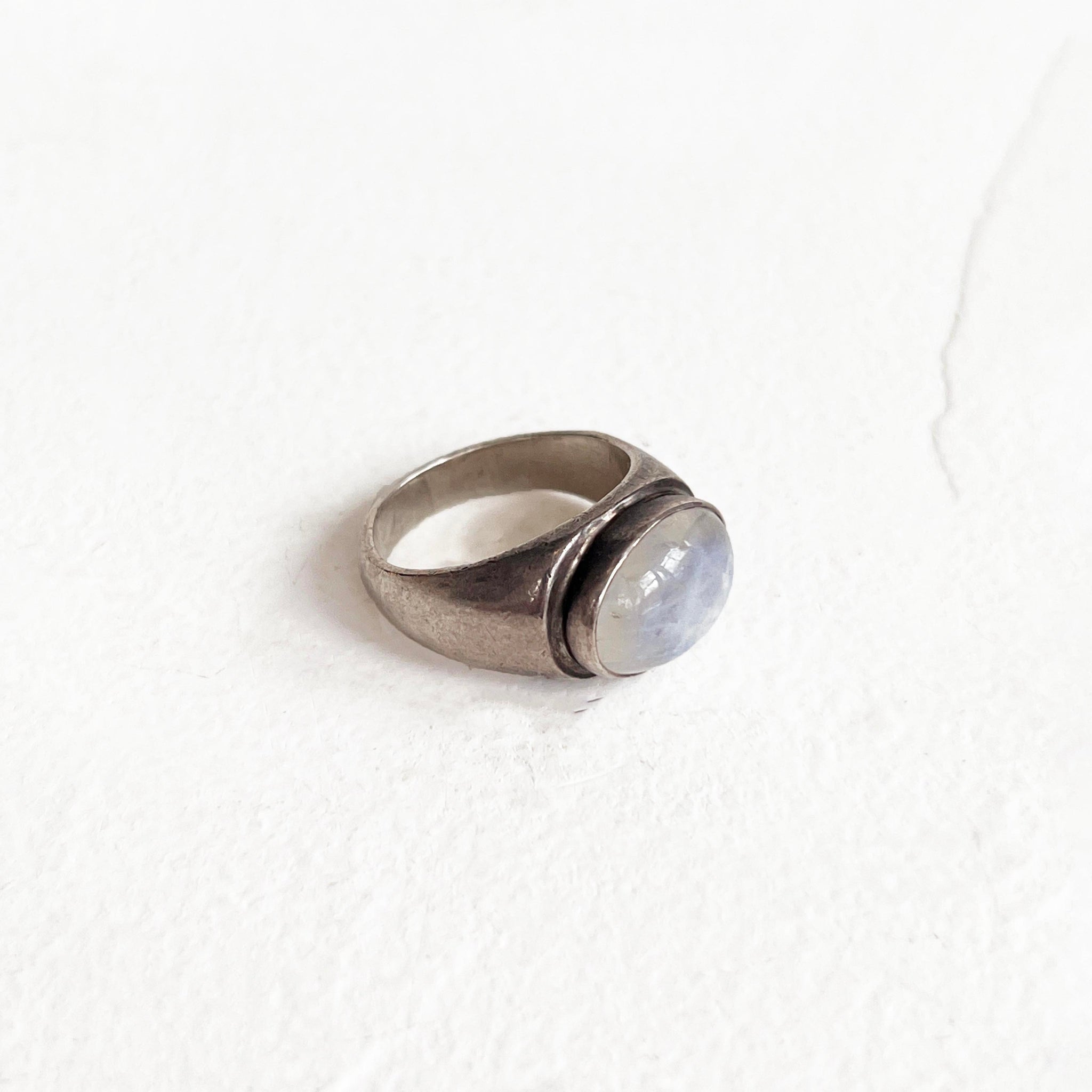 Beautiful vintage sterling silver ring featuring a luminous rainbow moonstone, celebrated for its shimmer and subtle play of color. In excellent vintage condition.