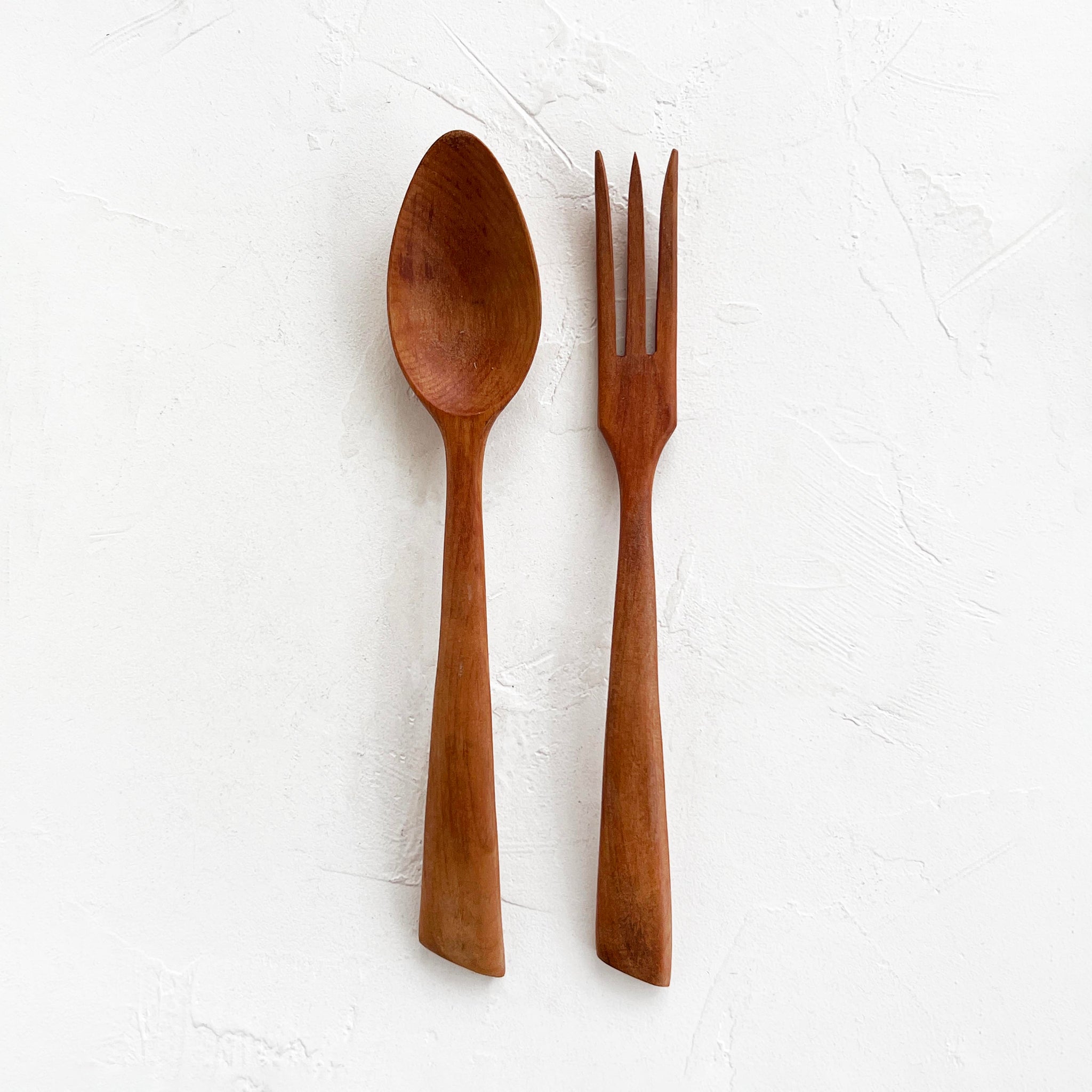 Premium teak wood salad server, hand-carved from smooth teak wood. It includes a spoon and a fork-spoon for efficient mixing and serving of salads and pastas. In excellent vintage condition.