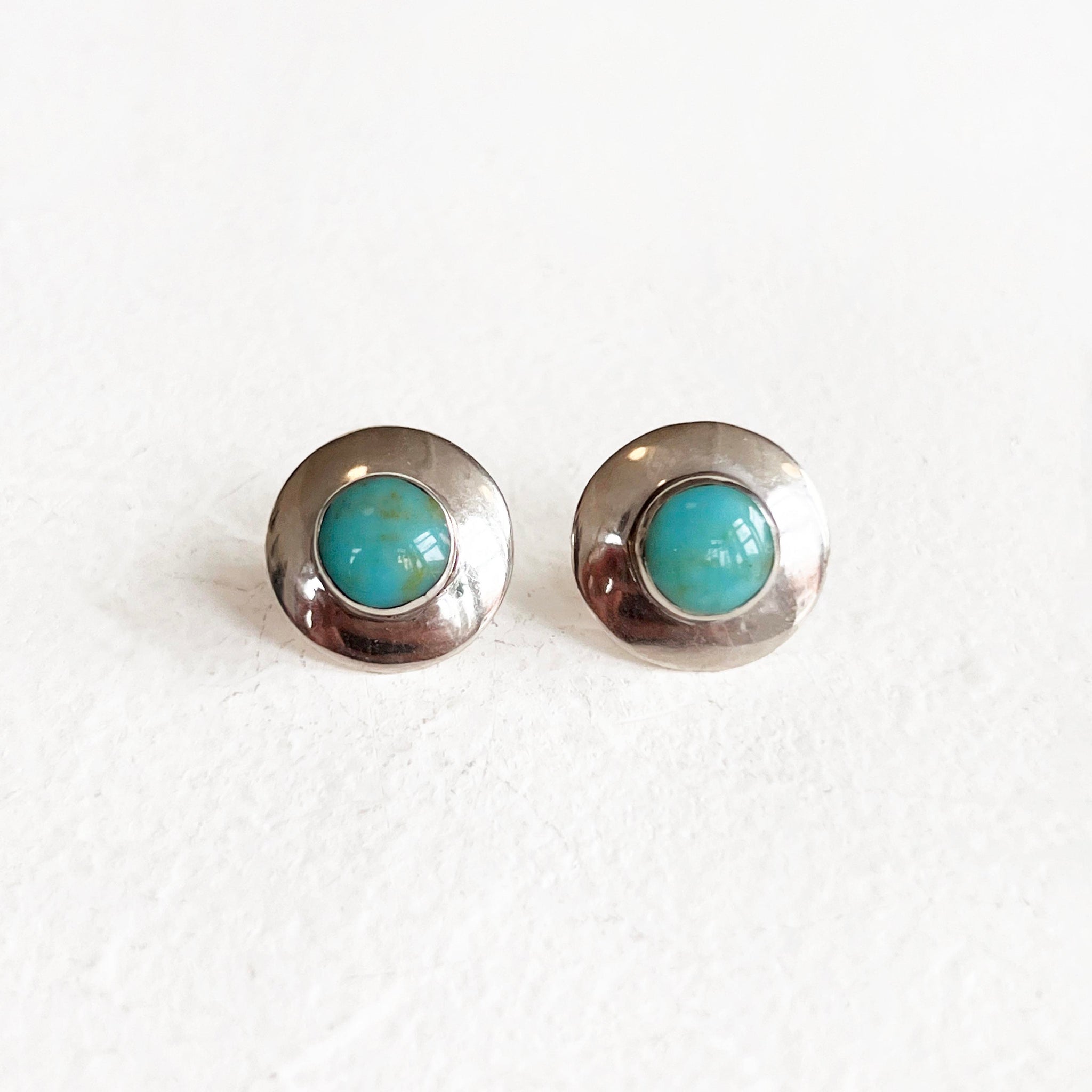Vintage sterling silver round earrings featuring a turquoise stud center from the 1980s, in excellent vintage condition.