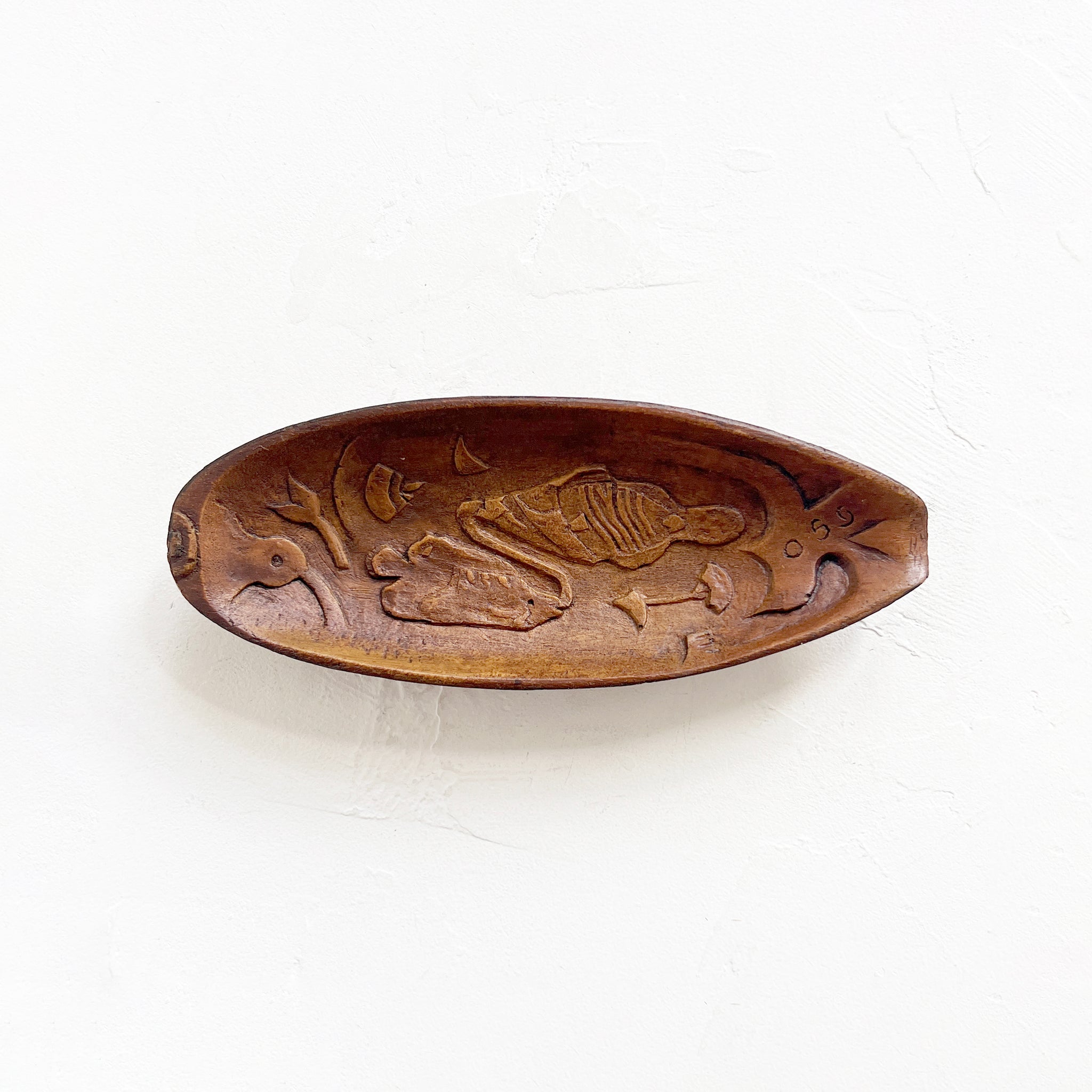 Charming vintage carved wooden bowl, beautifully etched with fish designs and crafted from high-quality bamboo. It's not just a stunning display piece; it also serves perfectly as an incense tray.