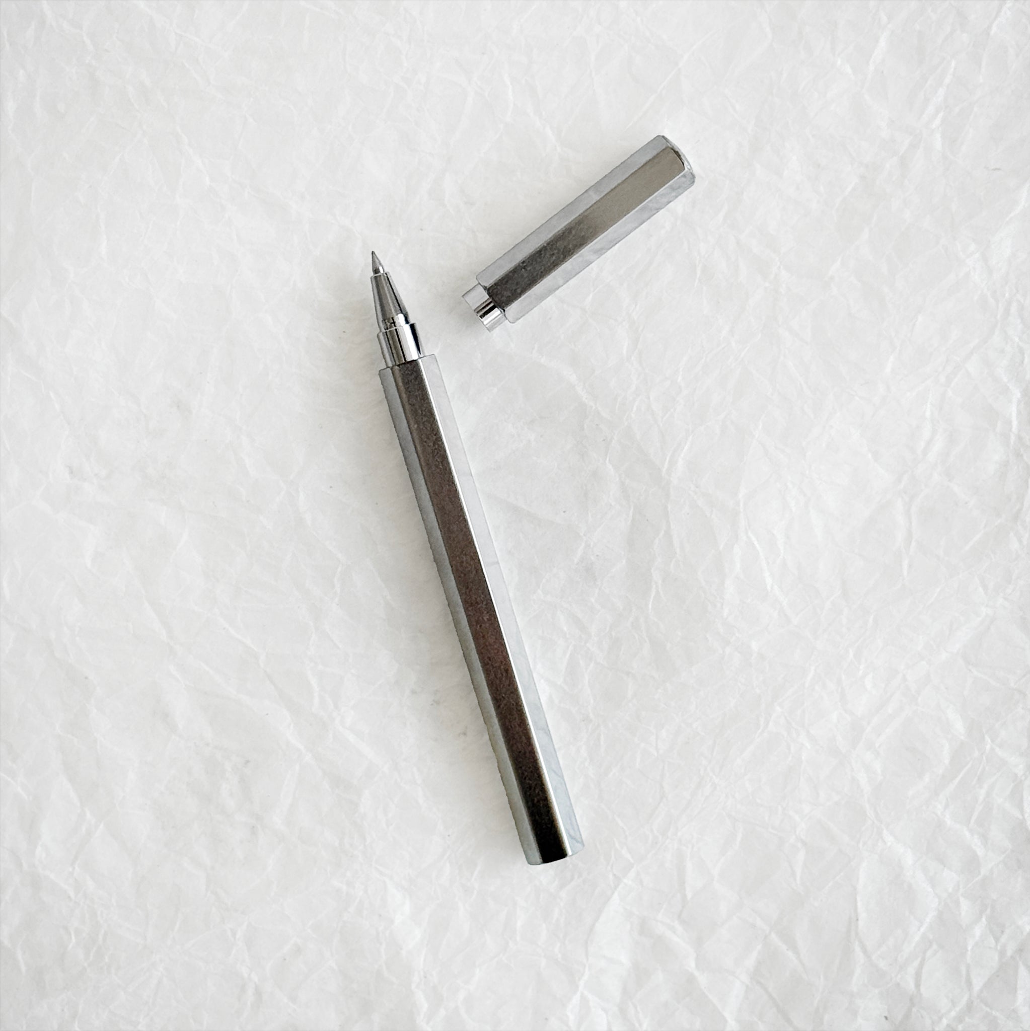 This ballpoint pen has a hexagonal shape that feels comfortable to hold. It is 10 mm wide on one side and balanced in weight, allowing for smooth writing without excessive pressure. The cap design avoids pins and clips for a solid look. The connection between the cap and shaft is flat, and the rounded edges of the cap add warmth to its simple design.