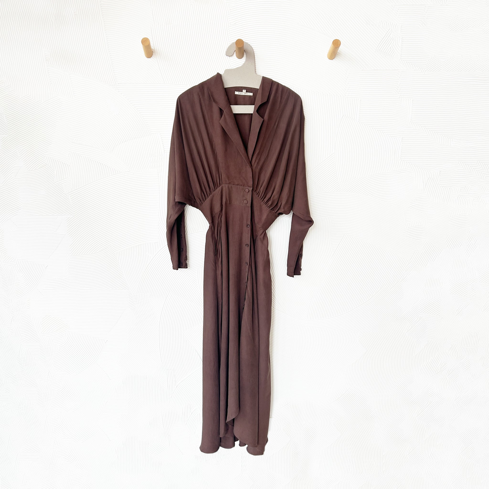 Indulge in elegance with this full-length silk dress in a luxurious chocolate brown hue. Impeccably designed, it showcases exquisite draping and flattering pleats that enhance your silhouette beautifully. The waist features silk-covered buttons for a refined touch, while handy slit pockets on the sides add a practical yet stylish element.