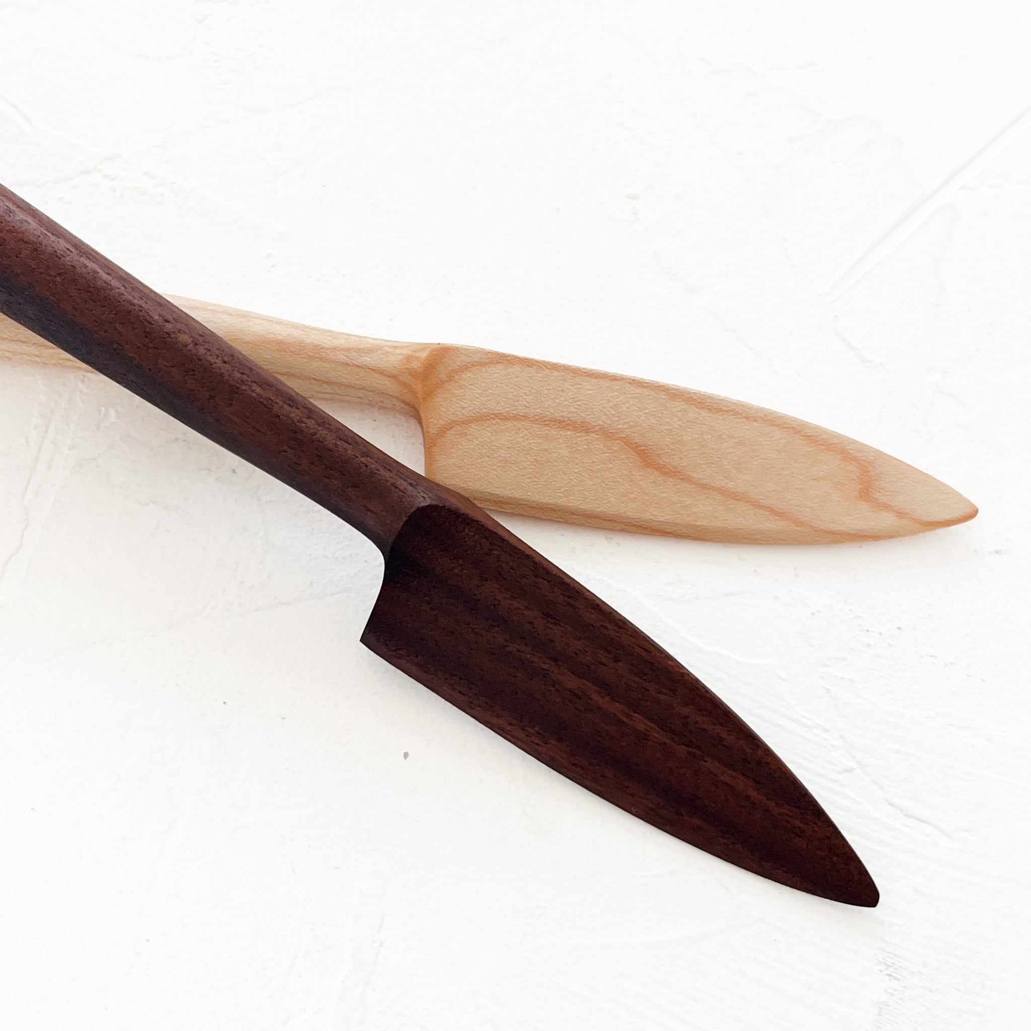 A butter knife that offers a striking design with a sharper tip. Great for cheese boards, spreads, and butter. Handmade from solid walnut and maple wood, and sanded to a polished finish. The knife is sealed with conditioner made from mineral oil and beeswax.